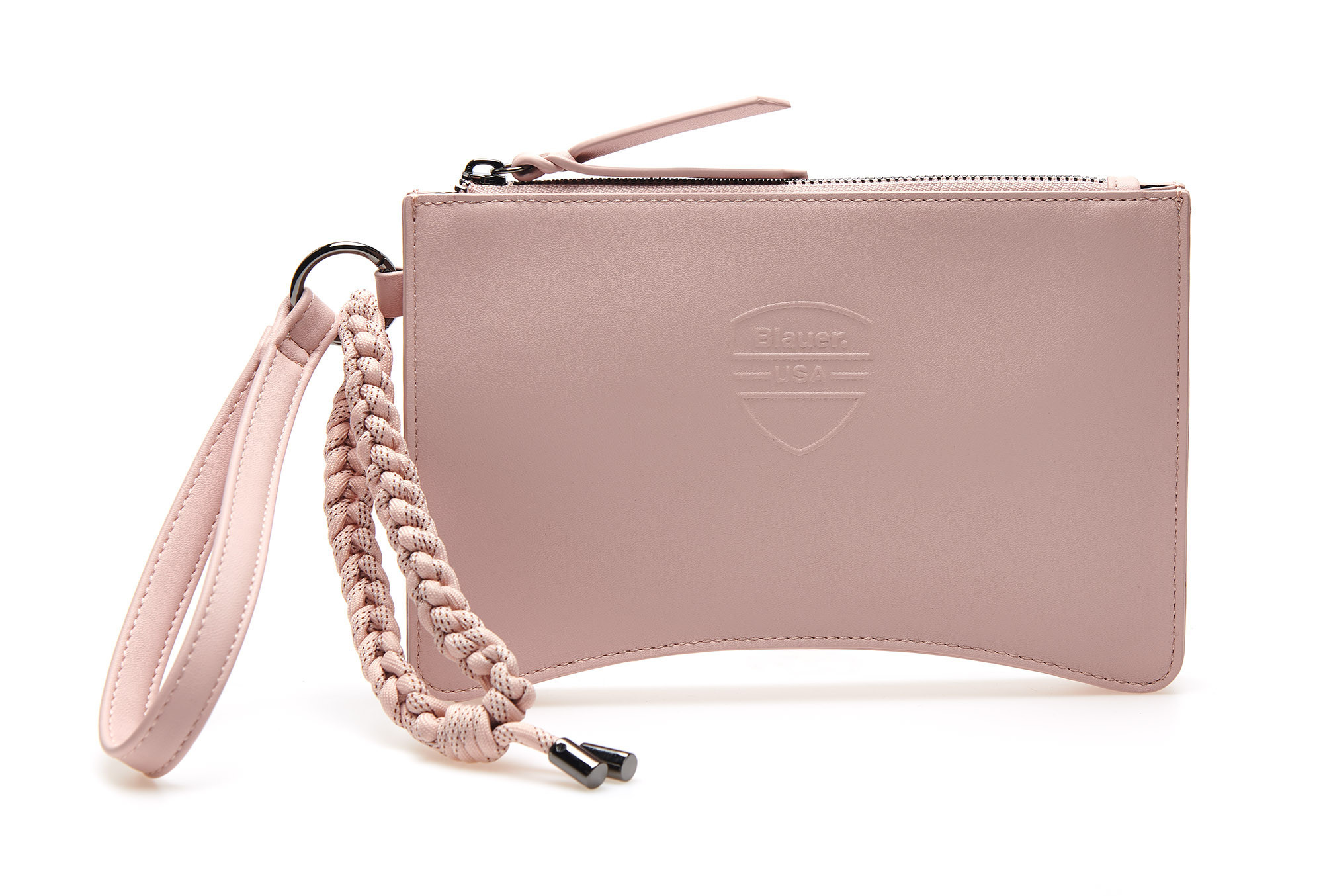 Blauer pochette rosa con logo in tinta, dotata di due bracciali amovibili, in corda o in tinta. 23x3x14
