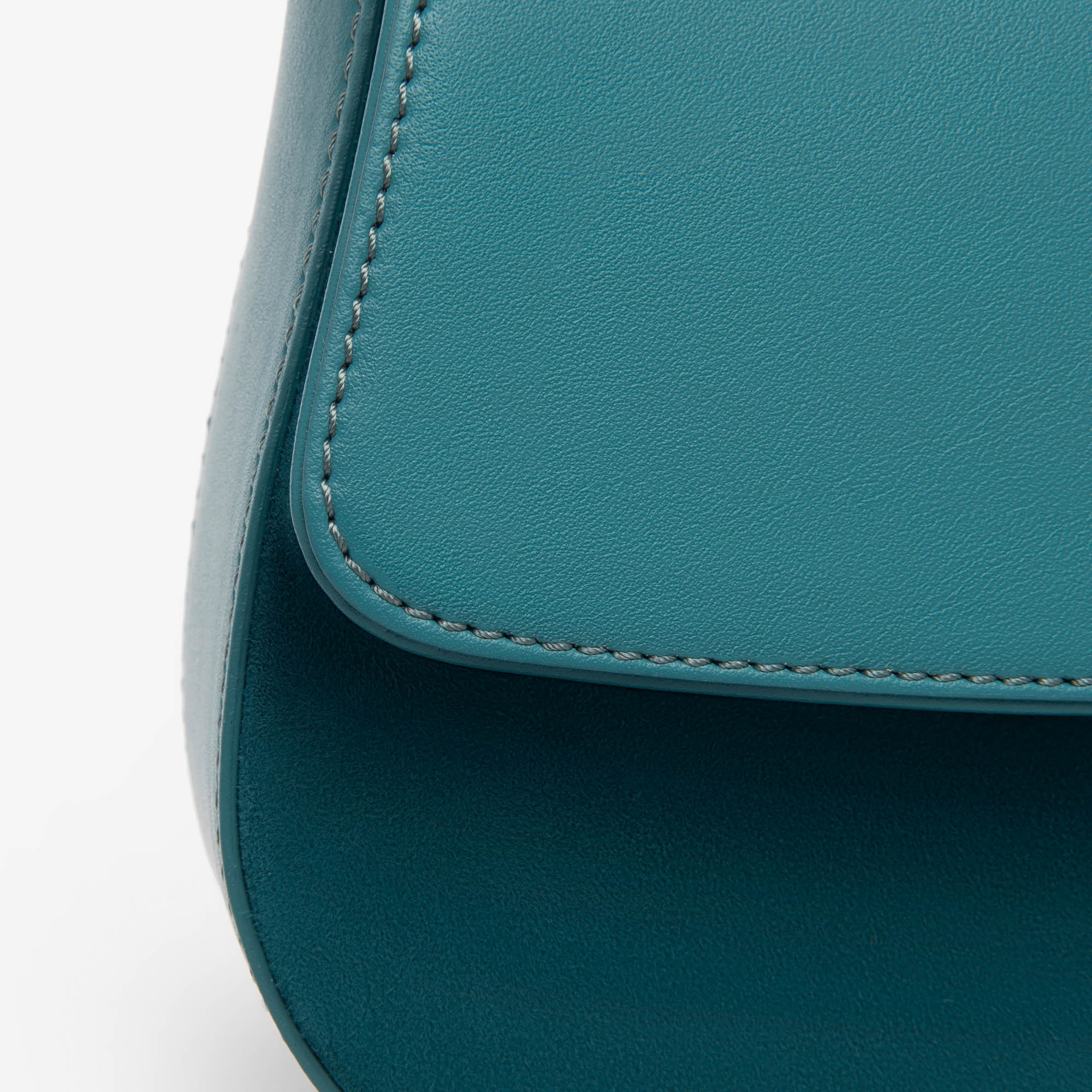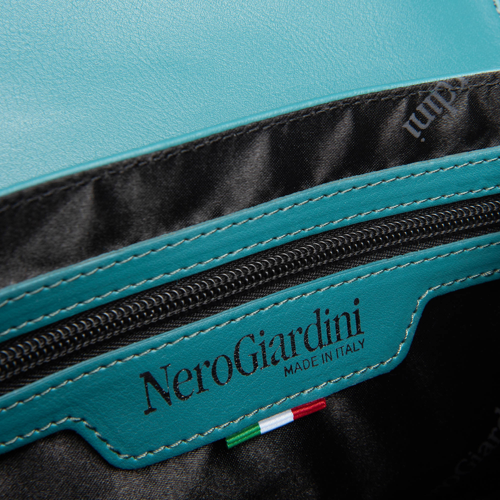 Nero Giardini pochette in camoscio e matriale tecnico color petrolio. Tracolla, chiusura con bottone, 22x15x6. Made in Italy.
