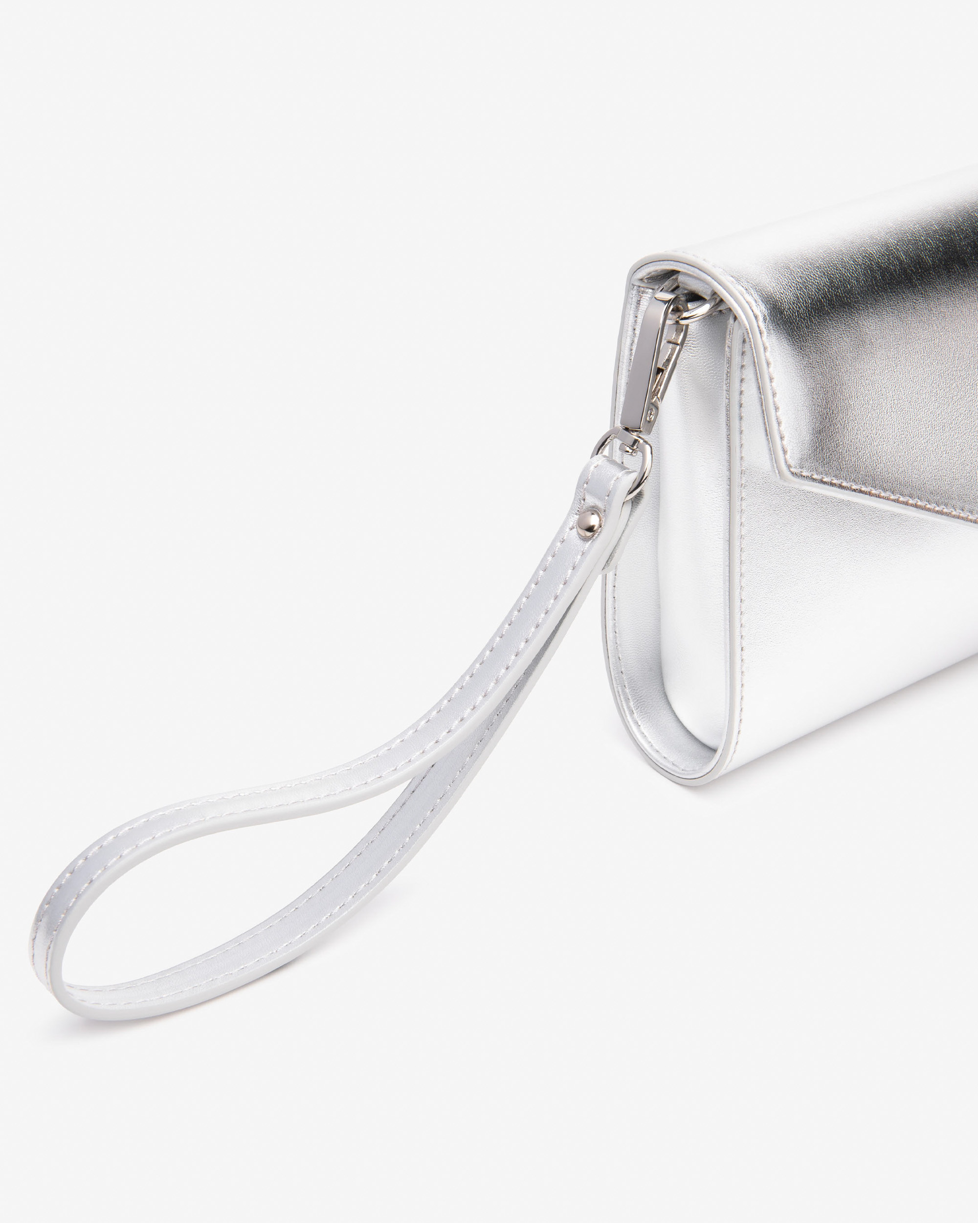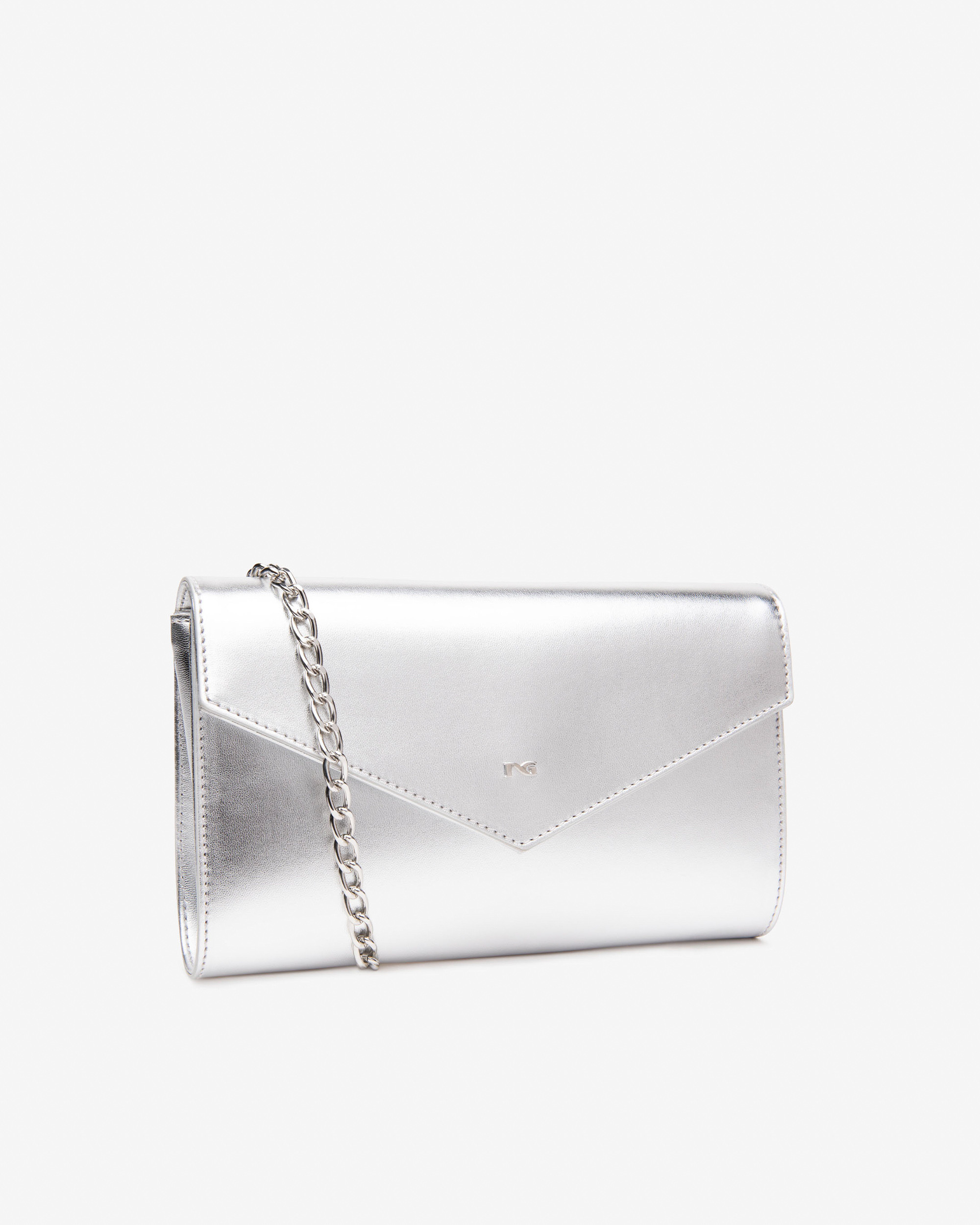 Pochette donna laminato argento Nero Giardini. Da portare al polso grazie alla pratica fascetta removibile o a spalla pratica alla tracolla removibile in catena. Chiusura bottone-calamita. Scomparto interno con tasche. 22x13,5x6. Made in Italy.