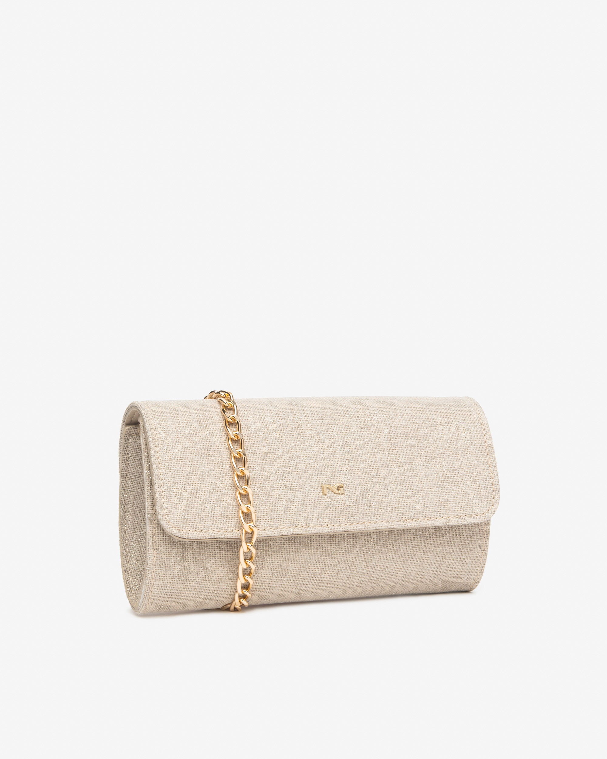 Pochette donna in tessuto lino lurex Nero Giardini. Dotata di una pratica tracolla removibile in catena. 19x10x6
