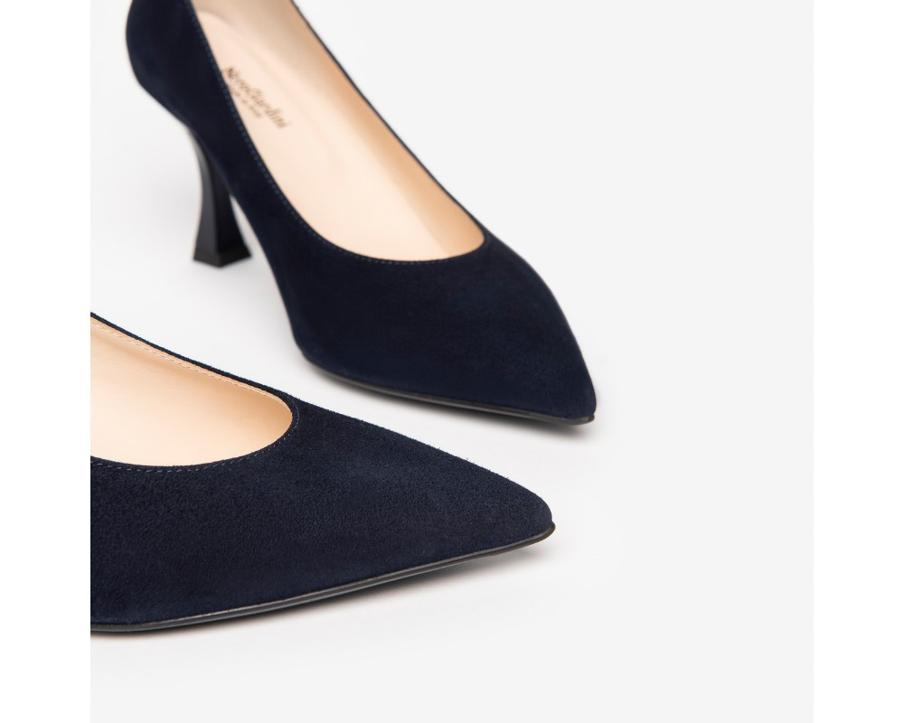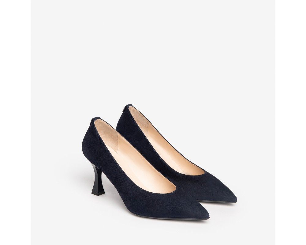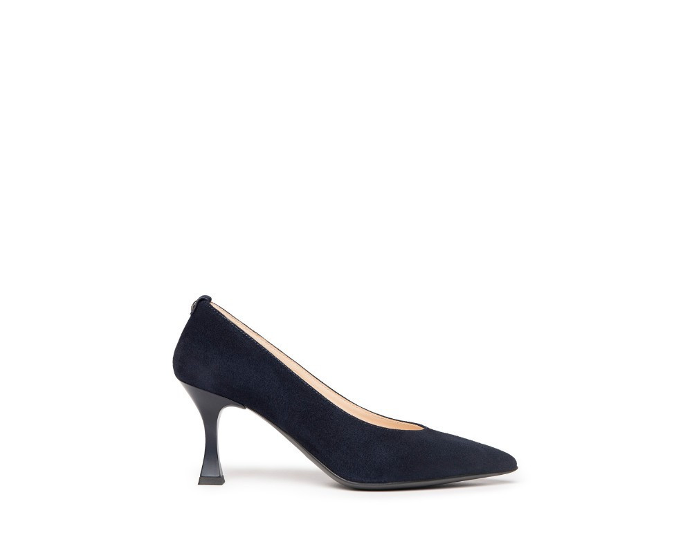 Nero Giardini décolleté in camoscio blu con logo sul tallone. Interno in pelle, fondo gomma e tacco 7.5cm.