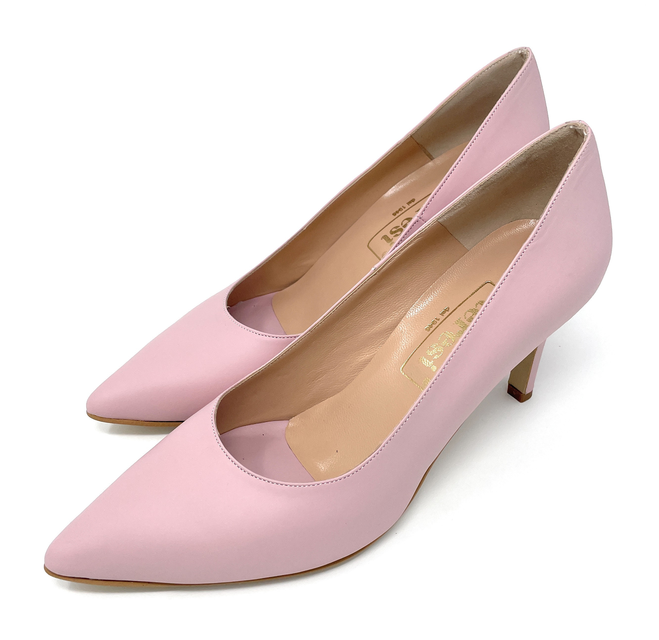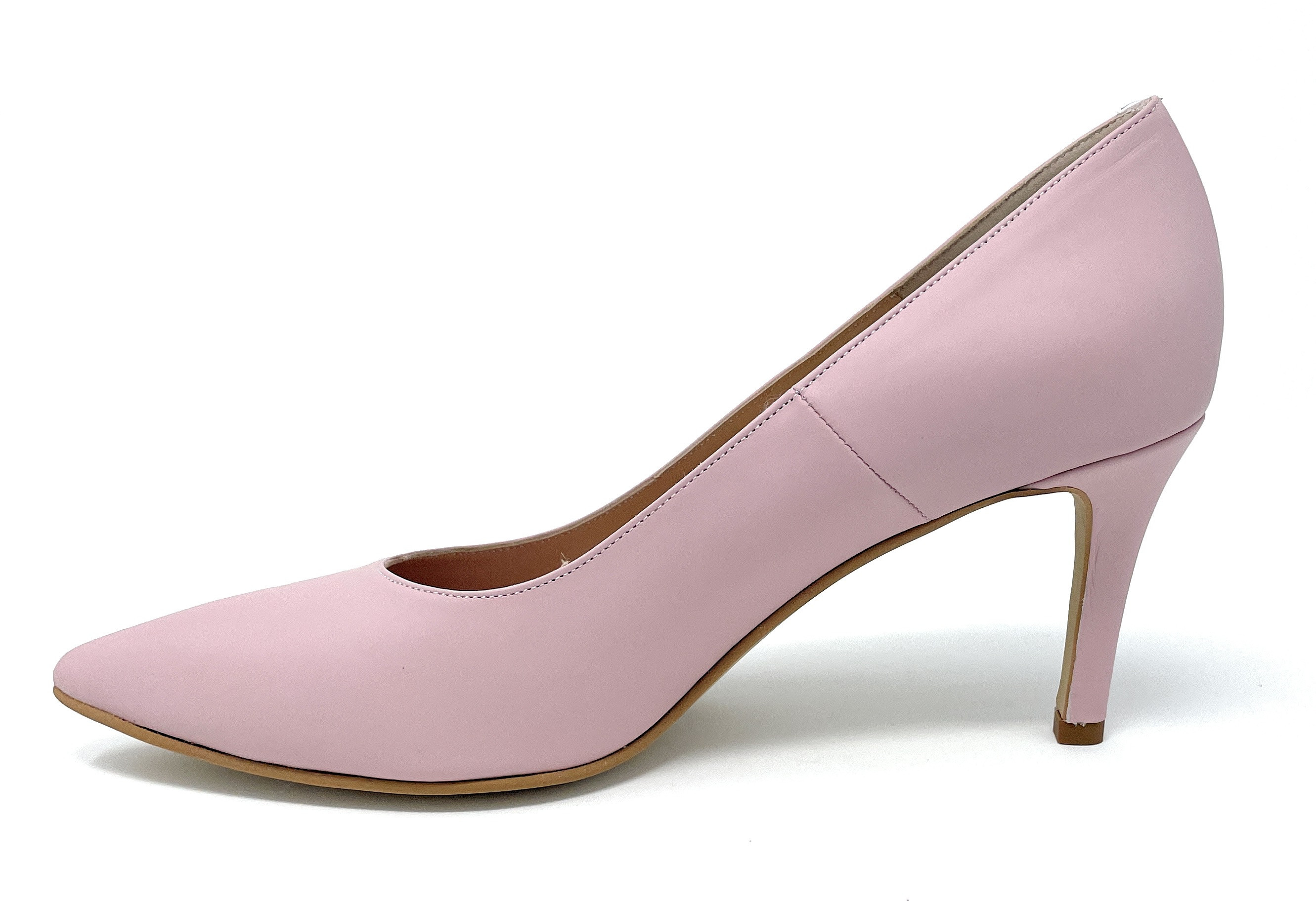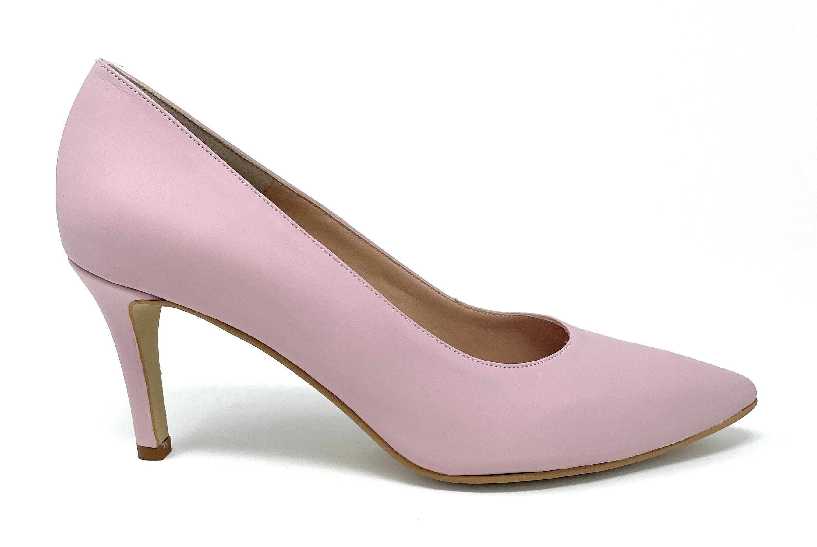 Teresi décolté in vitello cipria con sottopiede leggermente imbottito e fondo gomma per una calzata facile e confortevole. Punta affusolata e tacco a stiletto 7 cm.