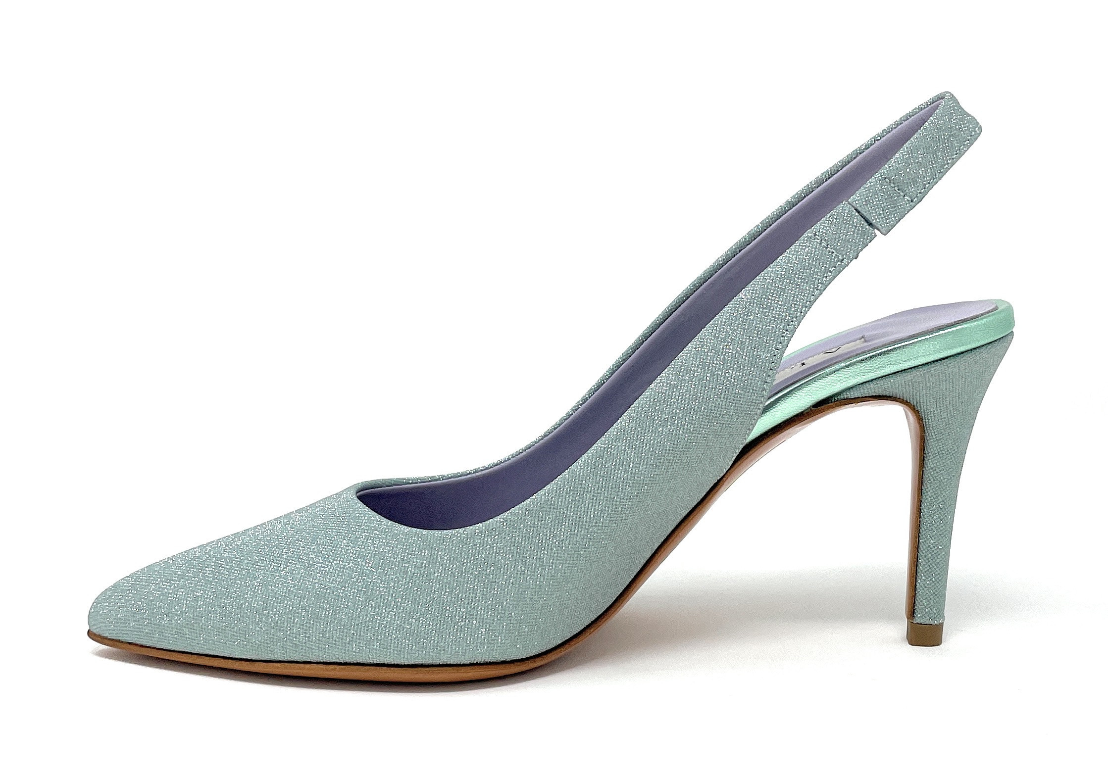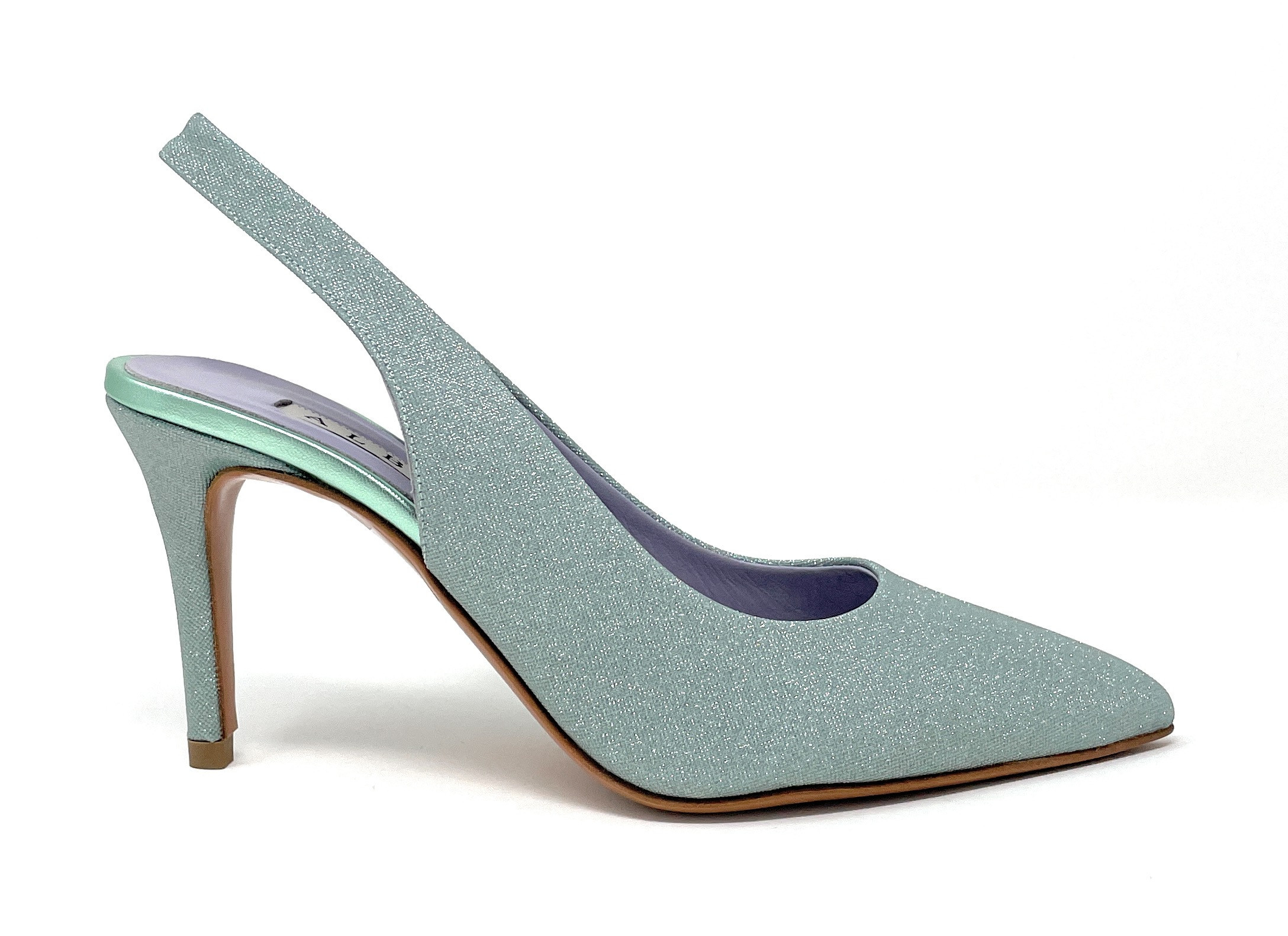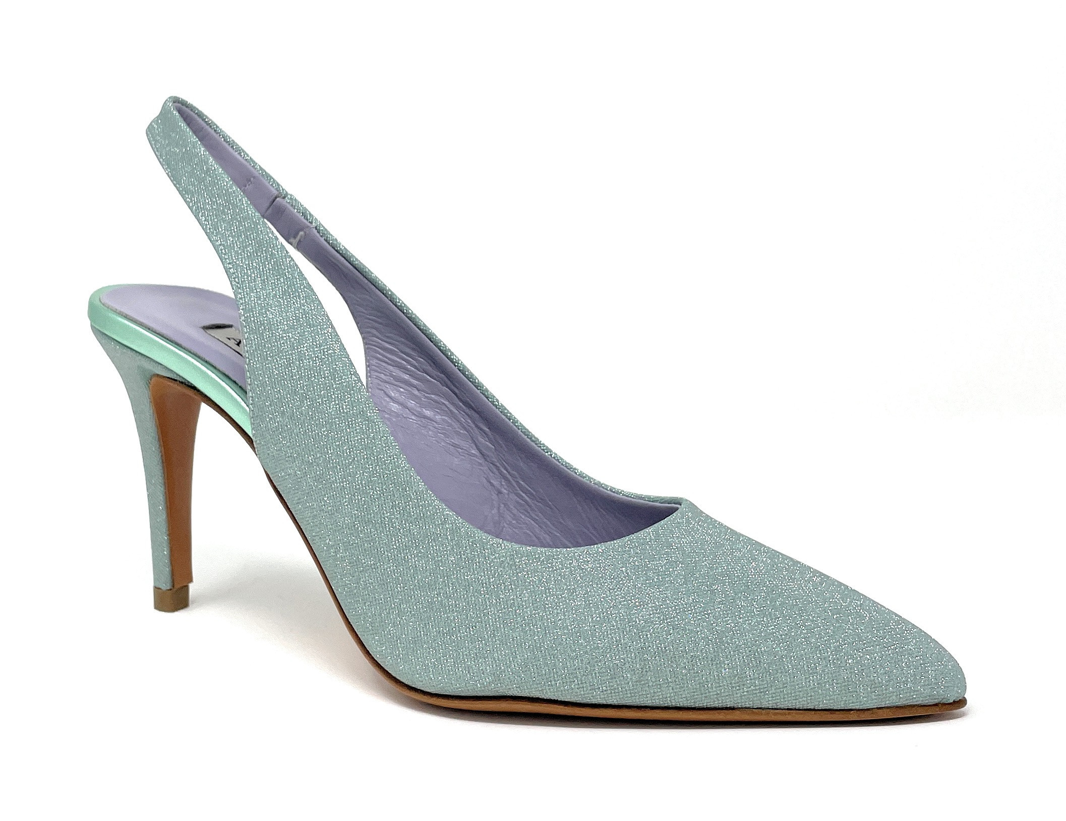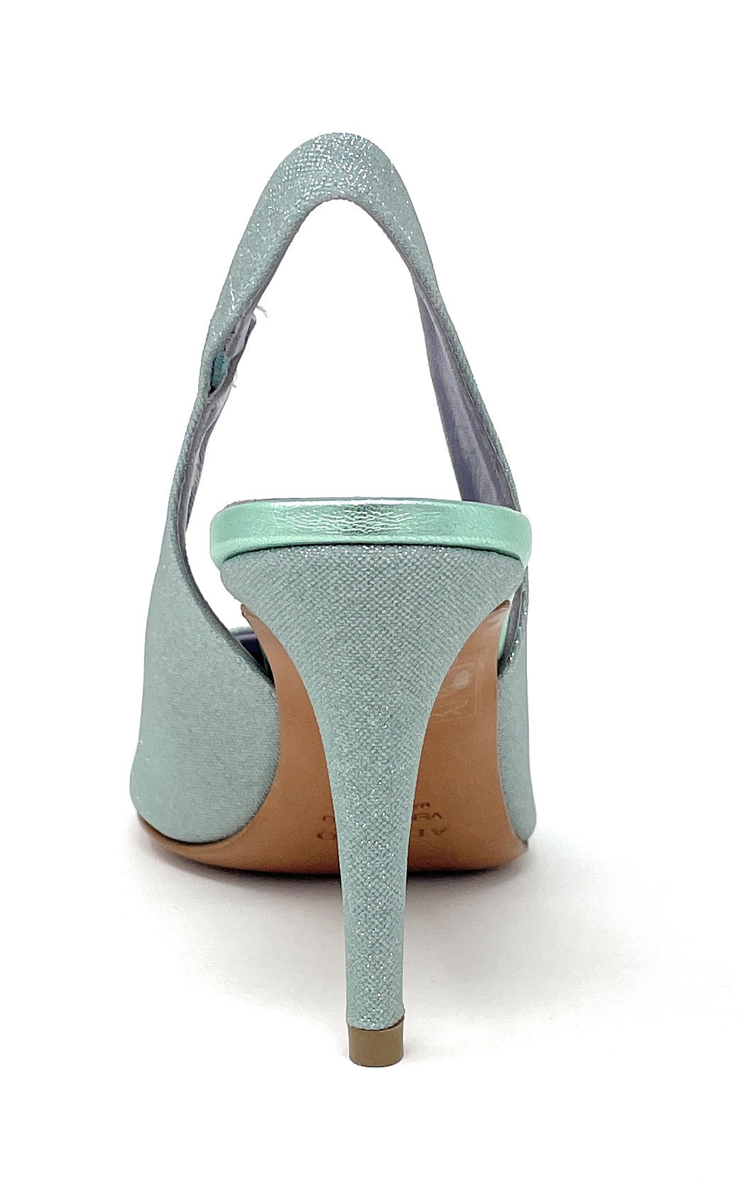 Albano sling-back in mesh menta con elastico alla caviglia. Fodera in pelle, suola in cuoio e tacco 7 cm.