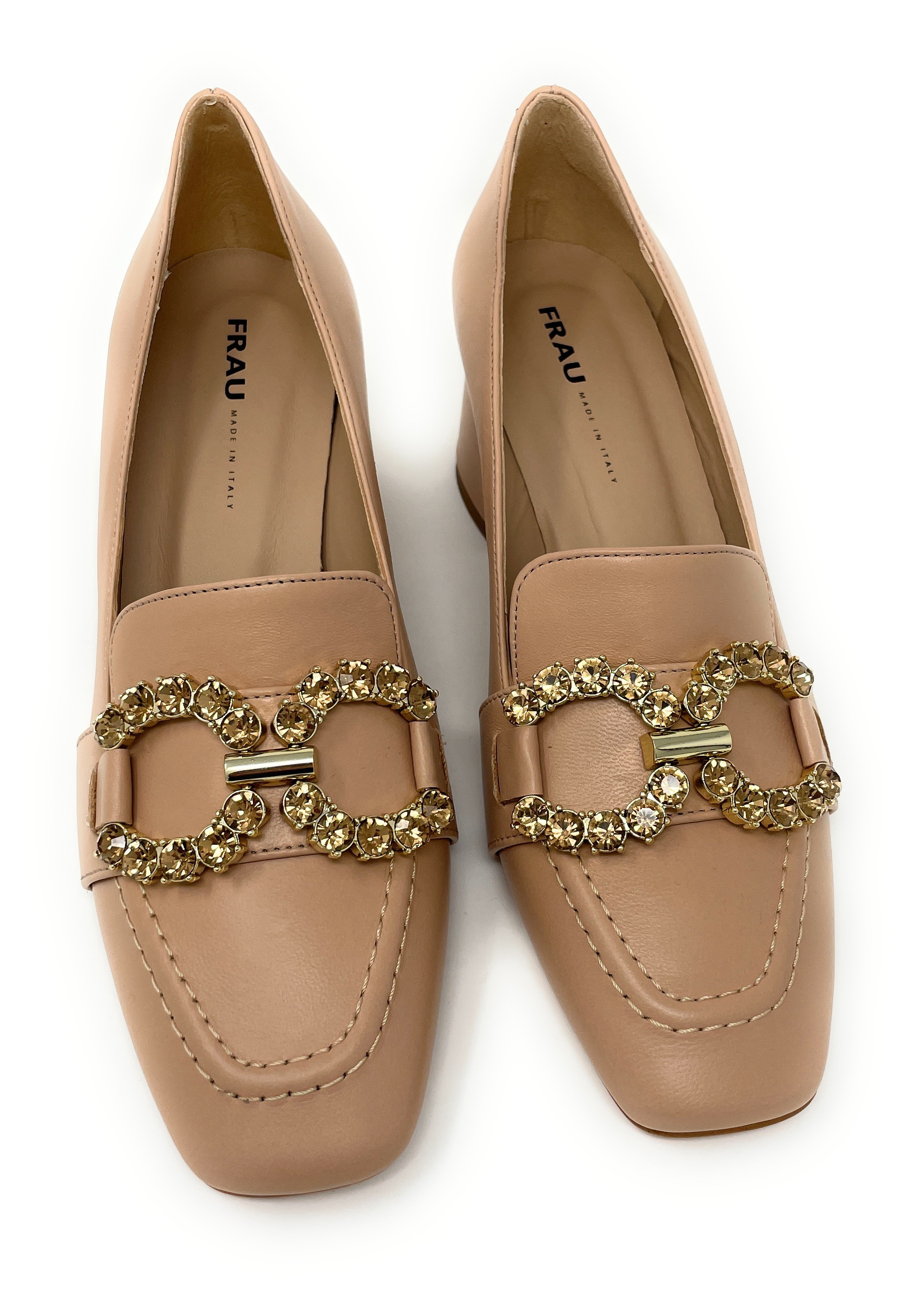 FRAU decolleté in morbida pelle impreziosita dal luminoso morsetto. Interno in pelle, morbido sottopiede e tacco largo 5 cm.