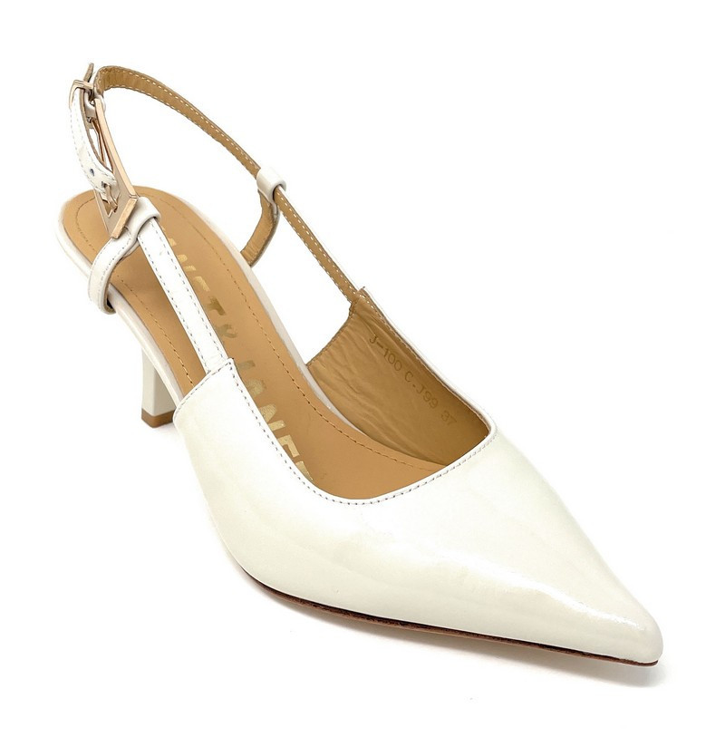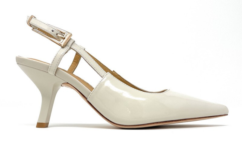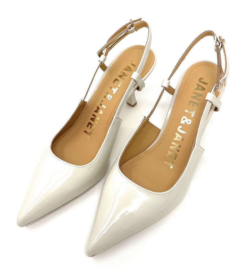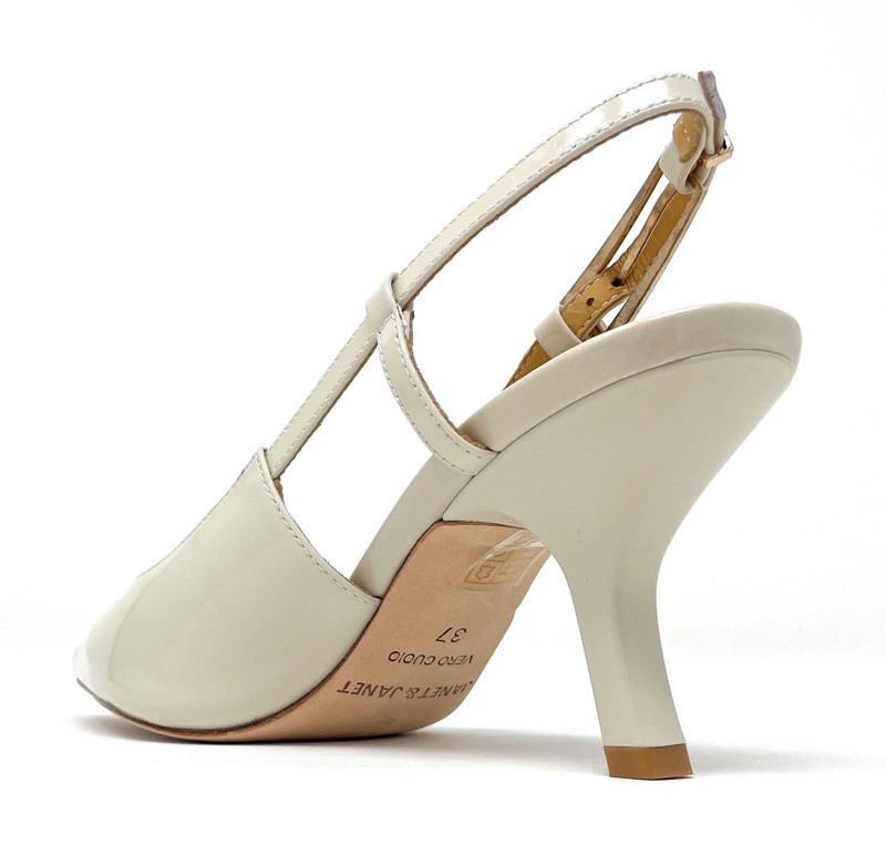Slingback in pelle verniciata beige Janet & Janet. Design moderno dal look elegante ma anche confortevole grazie al cuscinetto sotto il piede. Interno in pelle, fondo cuoio con tacco giometrico 7 cm.