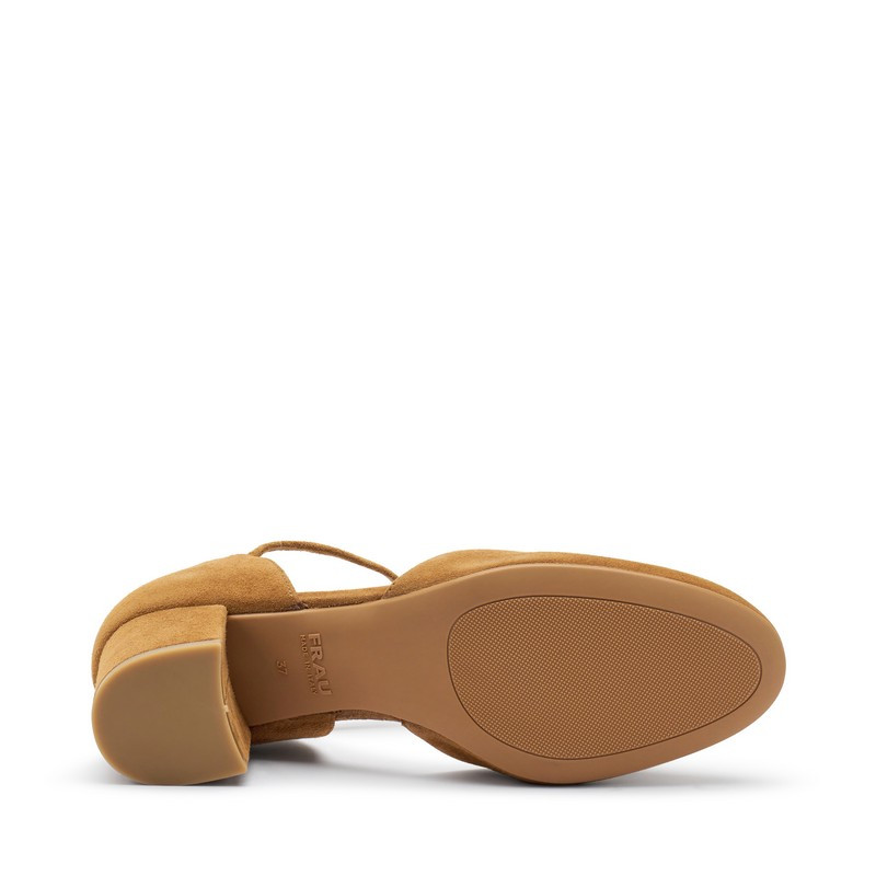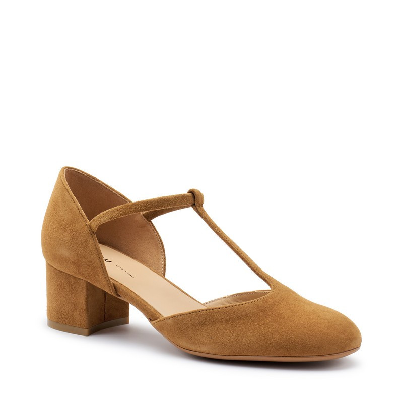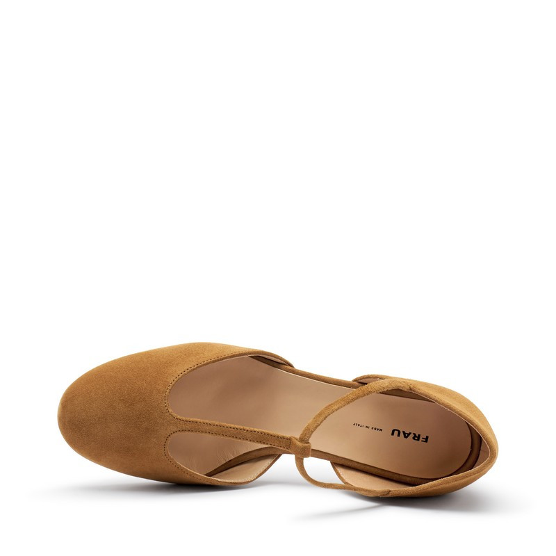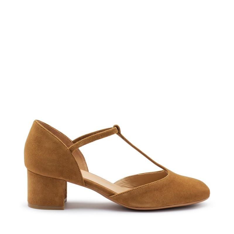 Decolleté Tbar in pelle scamosciata Frau. T-bar, così chiamate per il caratteristico cinturino centrale elastico a T. Foderato in pelle con morbido sottopiede e tacco foderato 5 cm. Made in Italy.
