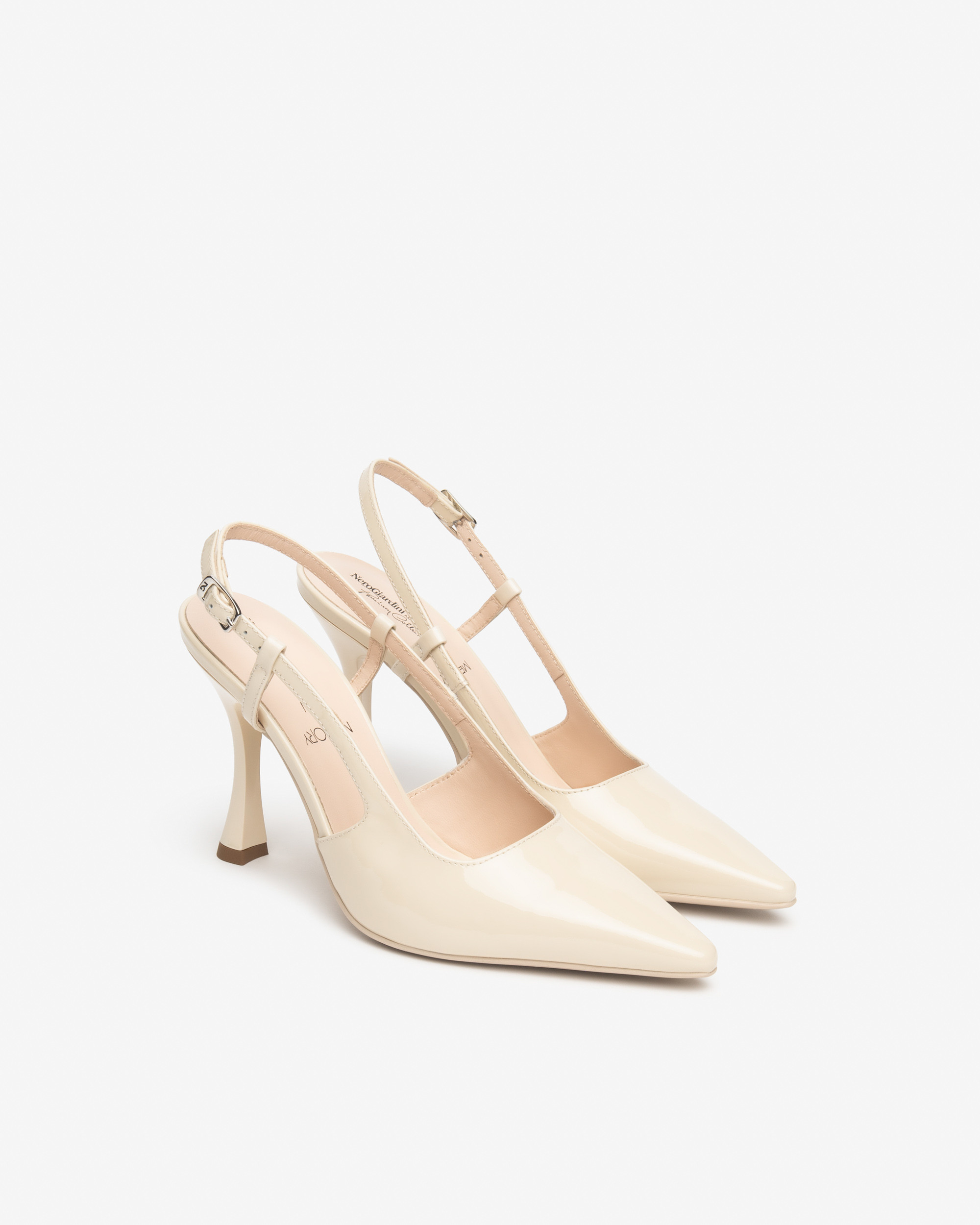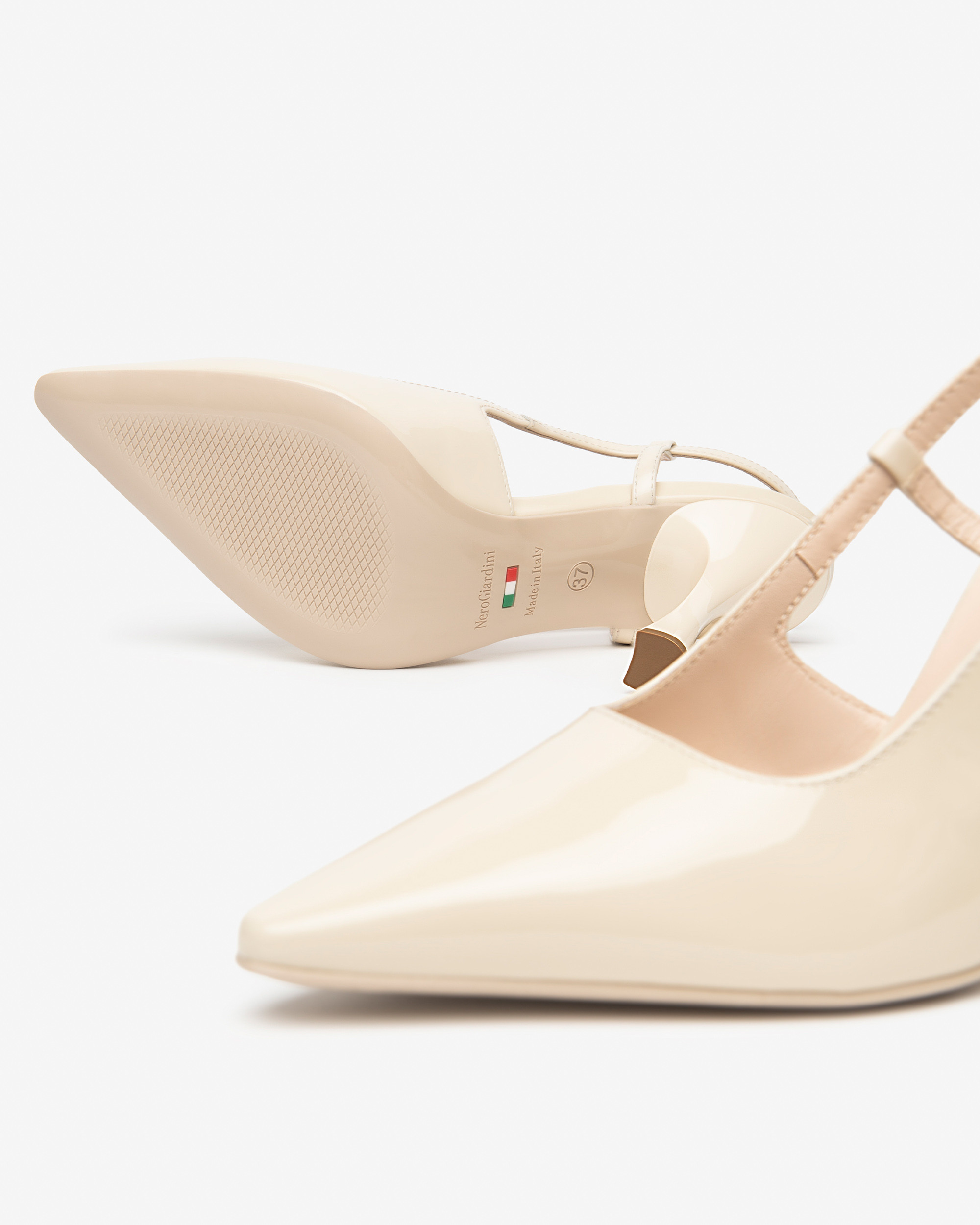 Slingback donna in vernice Nero Giardini. Interno in pelle, cinturino regolabile, fondo gomma e tacco a svasare 9 cm. Made in Italy.