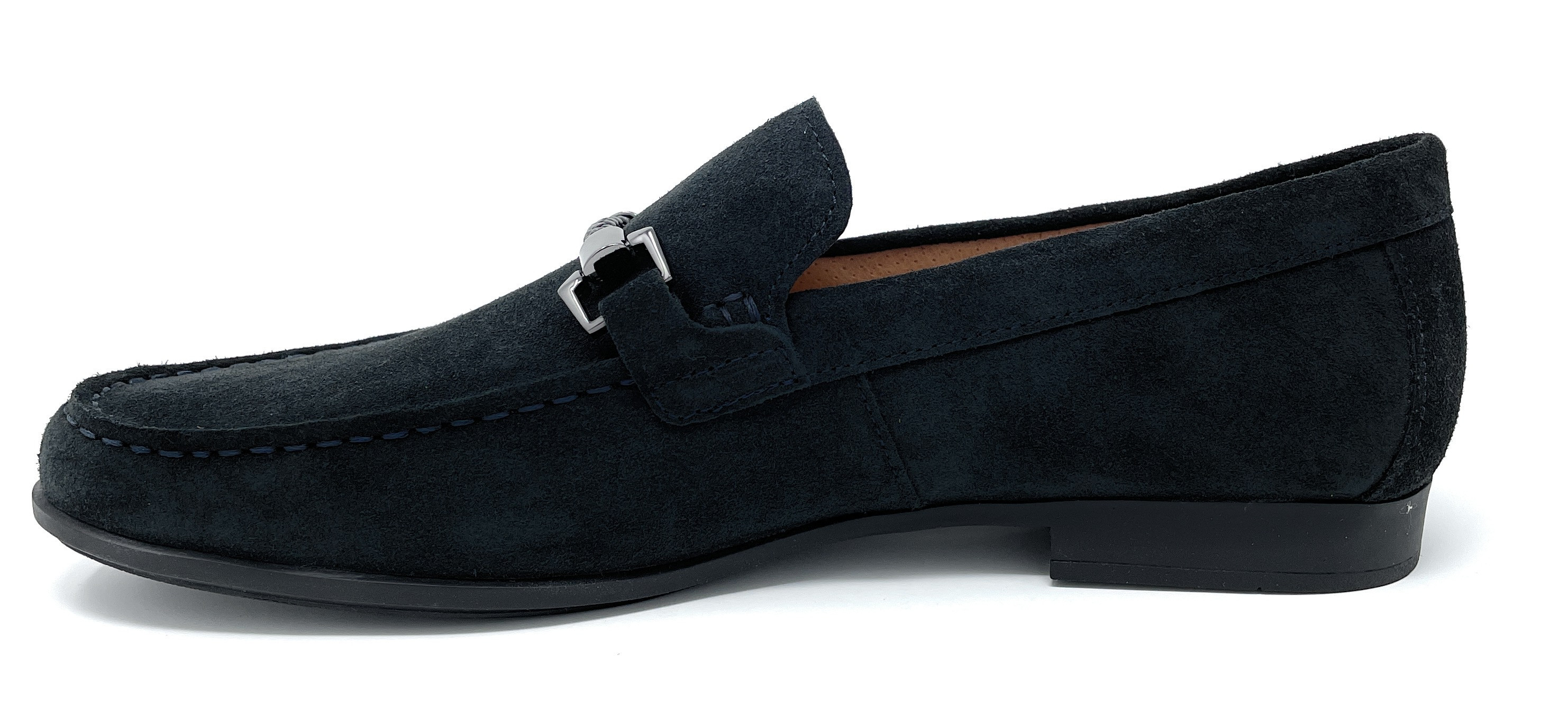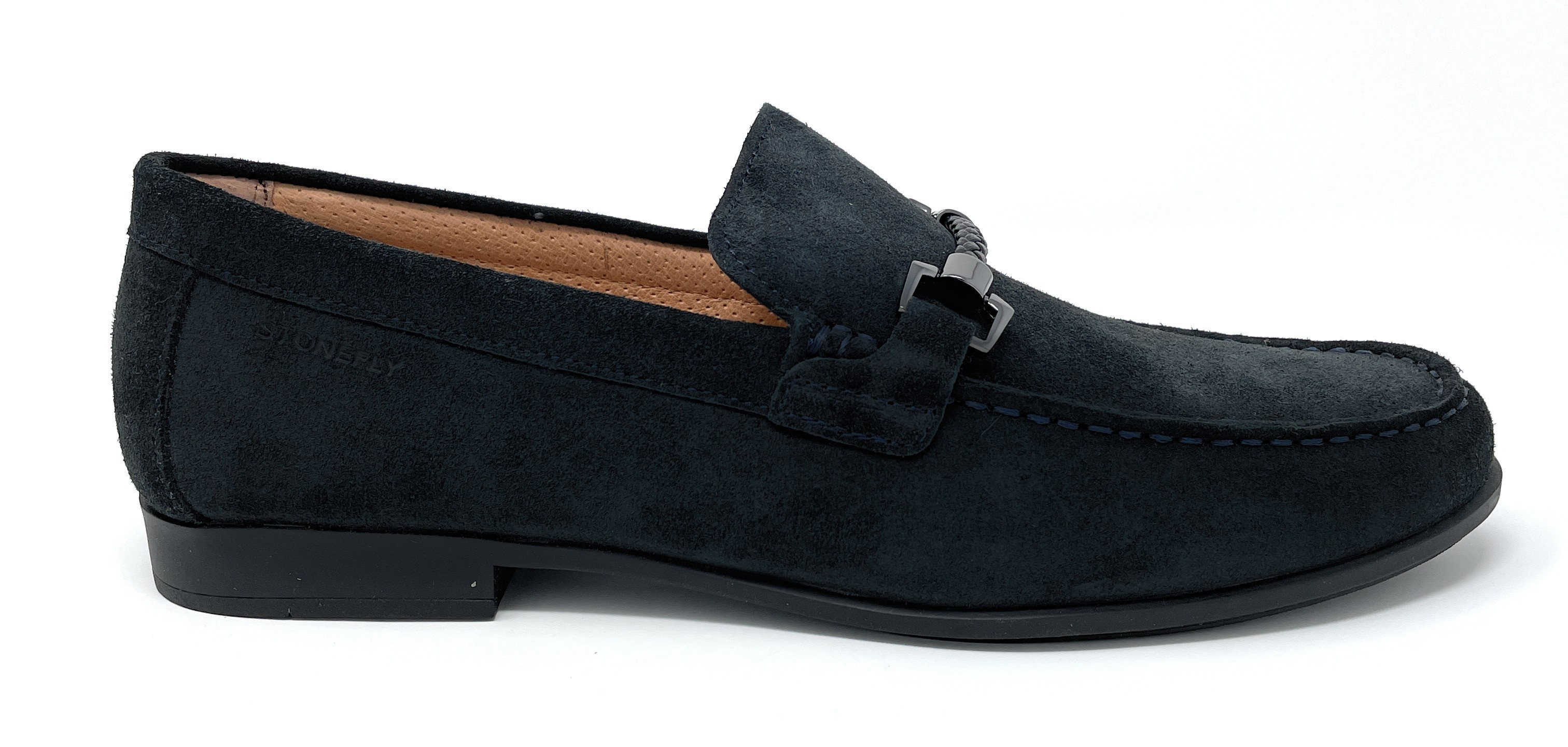Mocassino uomo Stonefly con morsetto intrecciato in camoscio blu. Fondo gomma con tecnologia blusoft per passi comodi e leggeri.