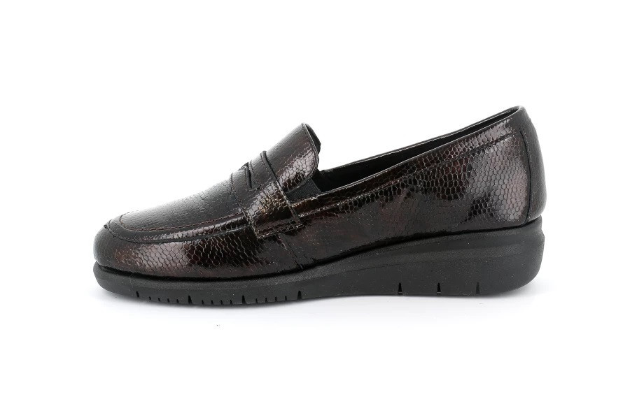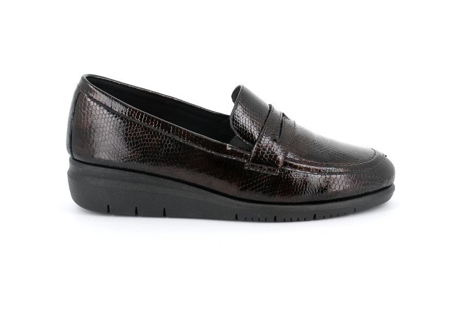 Mocassino donna in vernice con fascetta Grunland. Lo speciale sottopiede Grünland Re-Soft e' realizzato in doppio strato di schiuma di poliuretano traspirante. Morbida zeppa in gomma 4 cm.