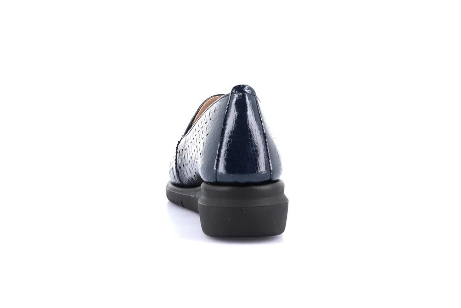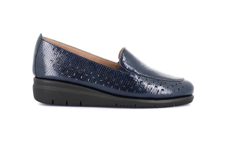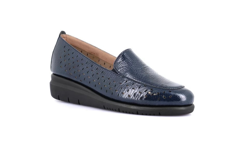 Slip on donna in vernice traforata Grunland. Tomaia cucita direttamente sulla suola e sottopiede Re-Soft che ammortizza l'impatto al suolo, rendono la scarpa leggera e comfortevole. Zeppa 4cm.