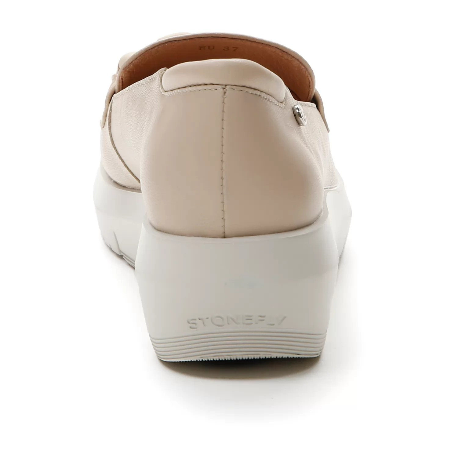 Stonefly mocassino in nappa color humus brown impreziosito da frange e catena in tinta. Interni in pelle e leggero fondo zeppa 5cm.