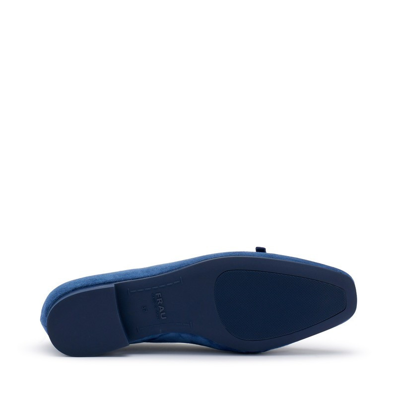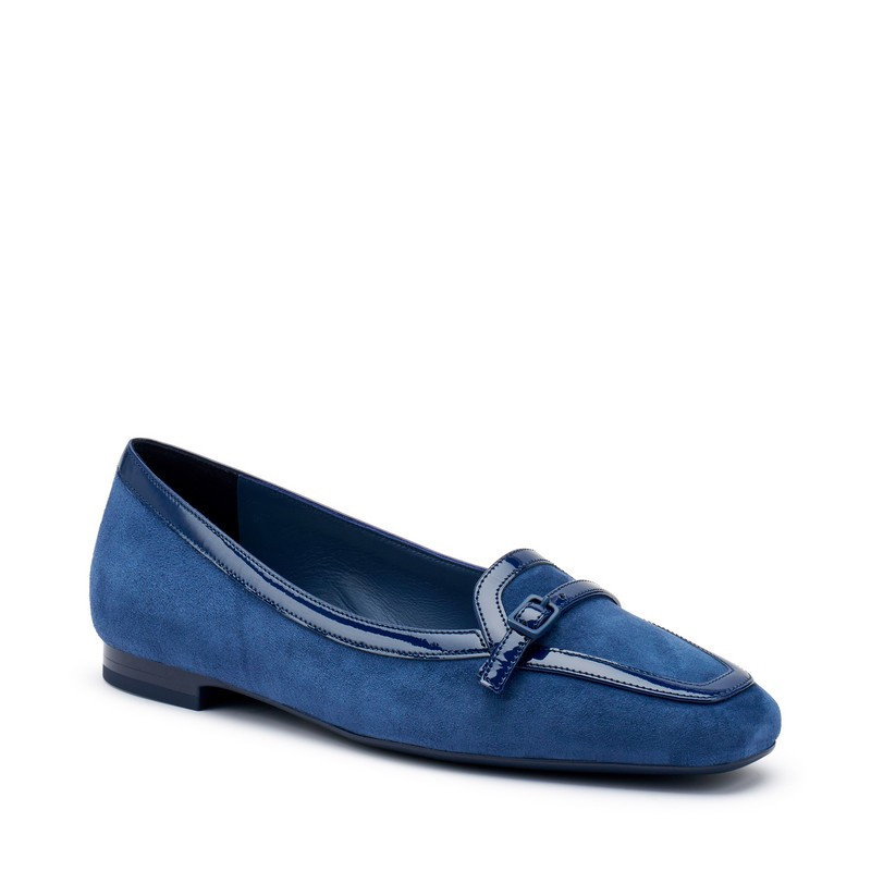 Mocassini donna in pelle scamosciata Frau con profili in vernice. Morbido e raffinato con sottopiede imbottito in pelle su fondo gomma 1,2 cm. Made in Italy.