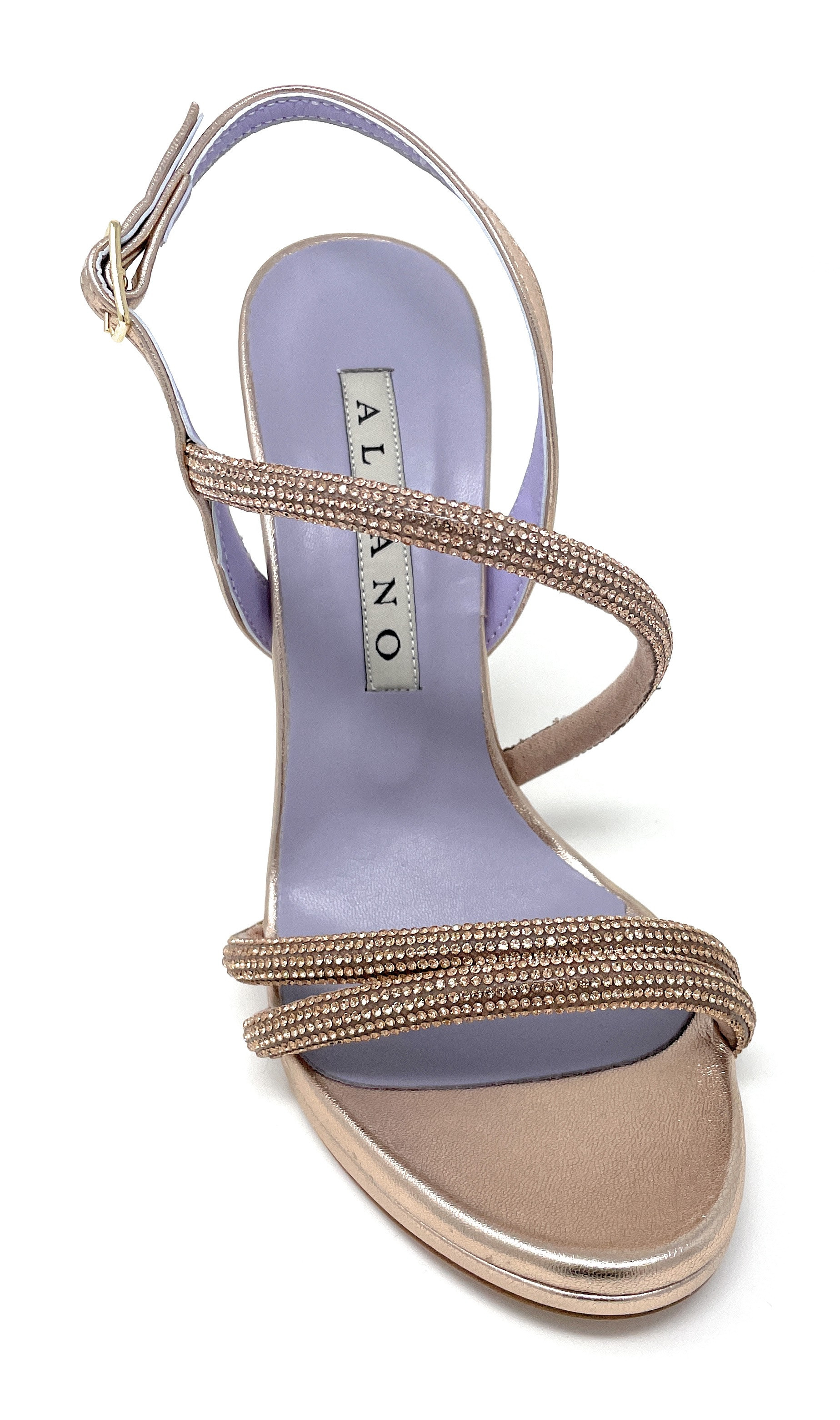 Albano sandalo metallizzato rame con listini in strass. Fodera in pelle, suola in cuoio, plateau 1,5 cm - tacco 11 cm.
