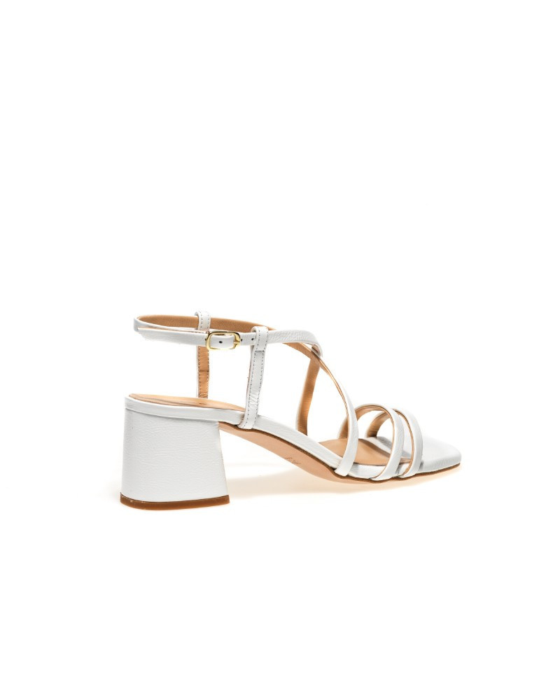 FRAU e2 sandalo in vernice bianca, caratterizzato da listini mignon che si incrociano sul collo del piede avvolgendolo delicatamente. Fodera e sottopiede in pelle, tacco 5 cm rivestito in vernice in tinta con la tomaia.