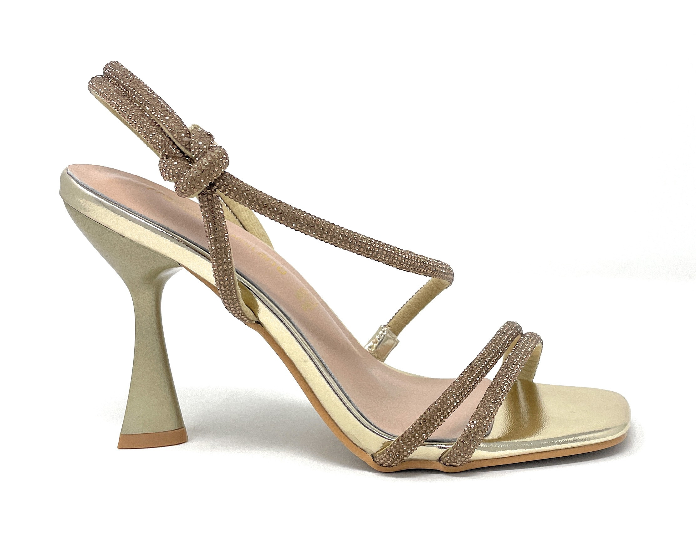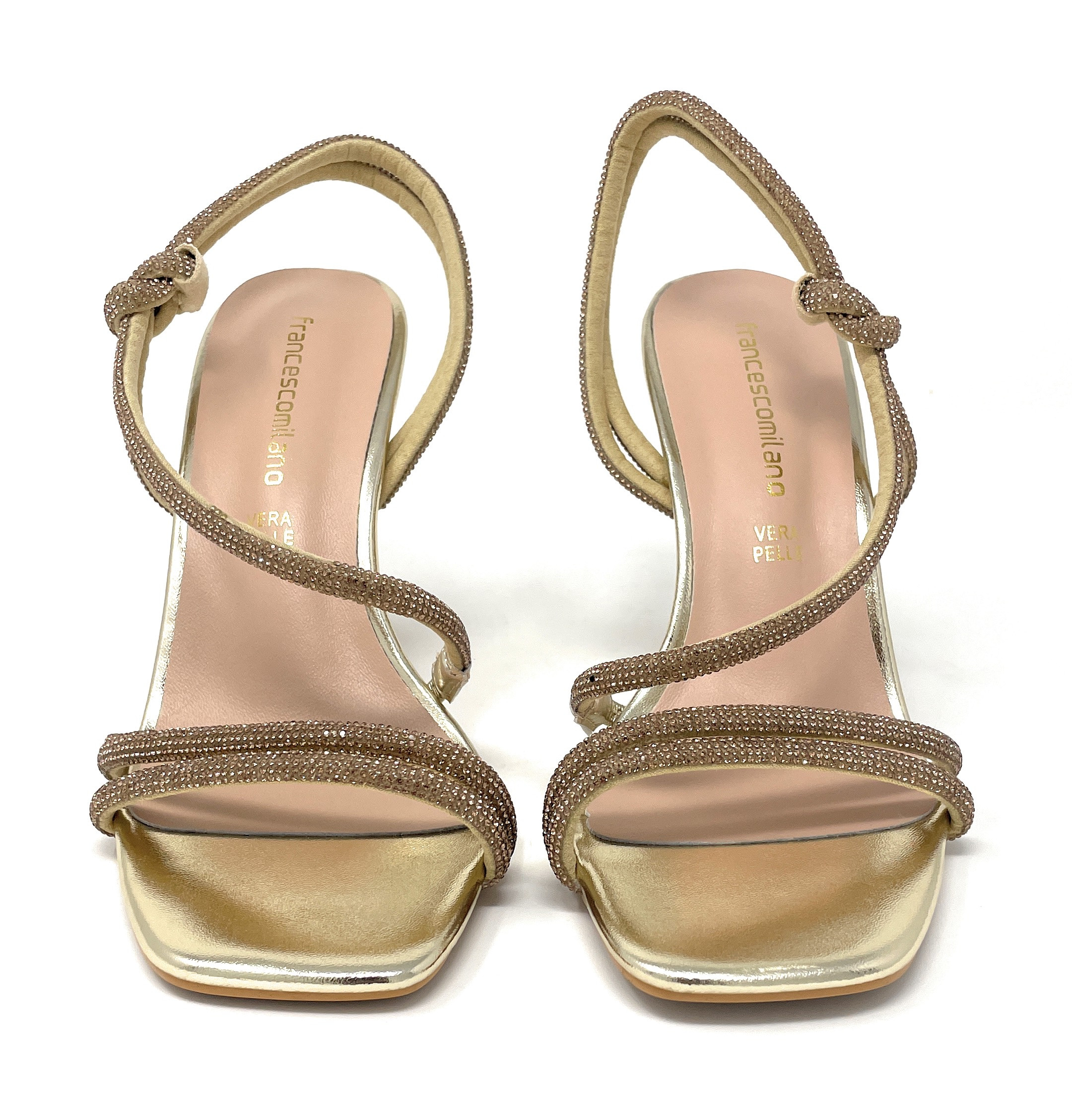 Sandali donna Francesco Milano, tomaia con fascette in microstrass. Sottopiede in pelle con cuscinetto. Tacco a svasare 9 cm.