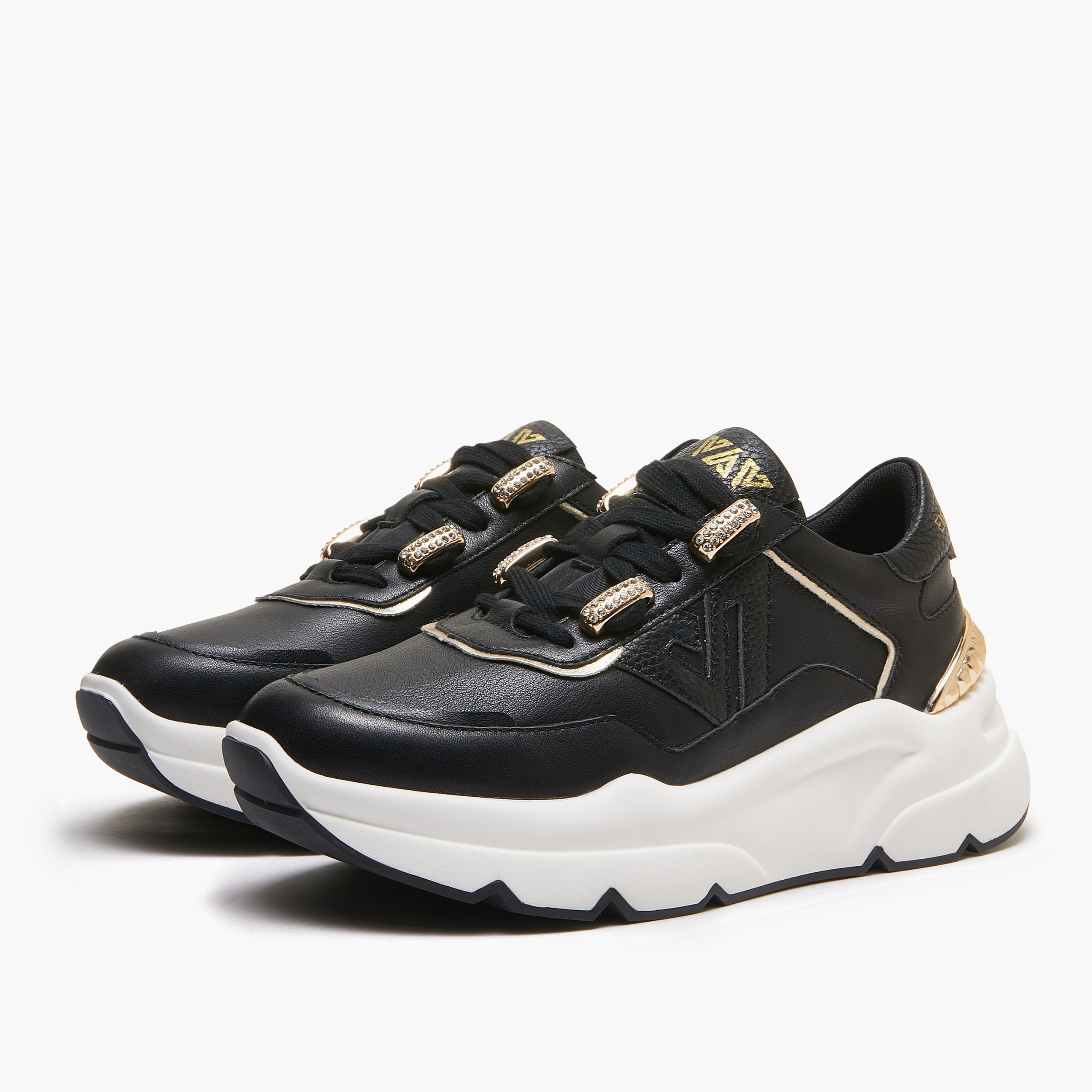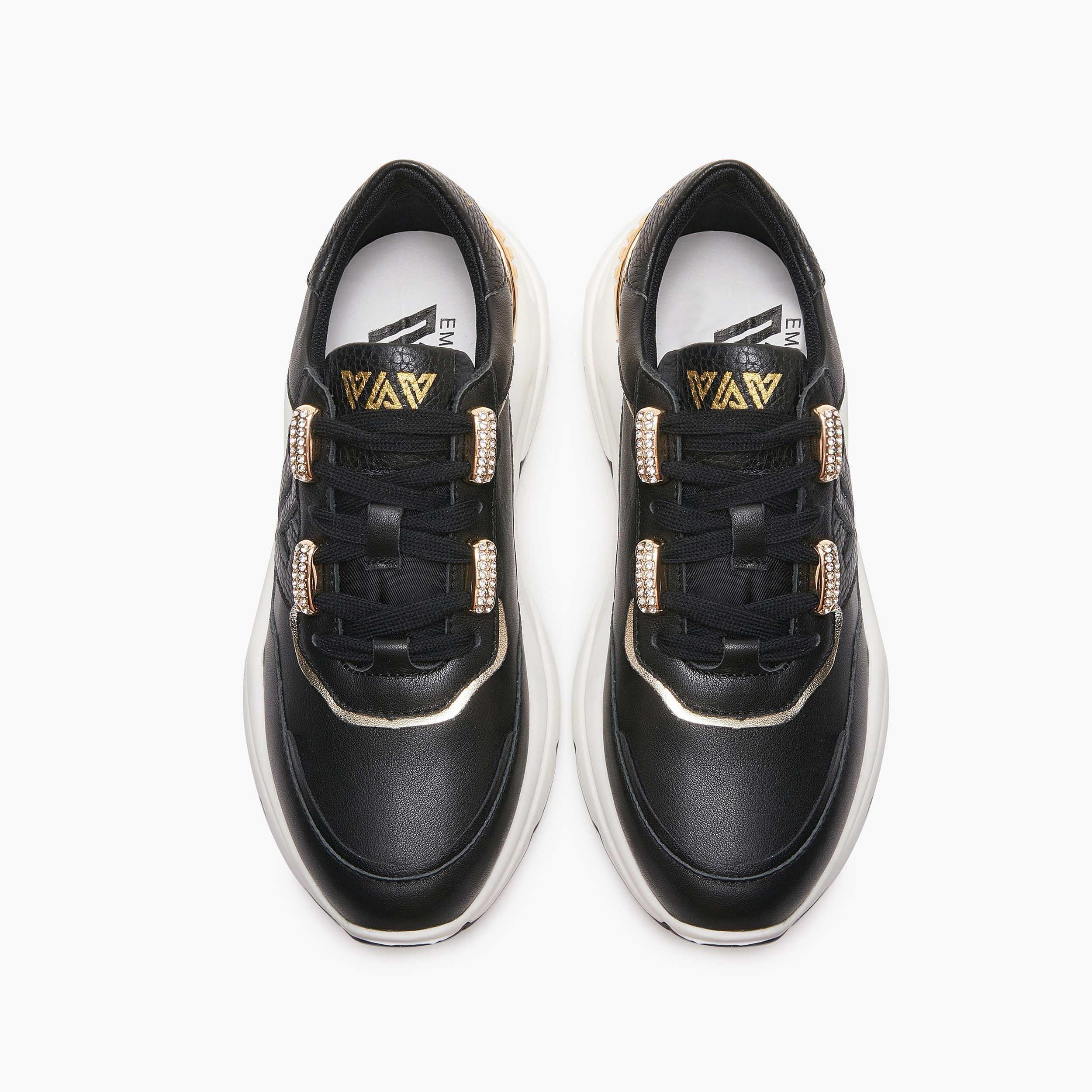 Sneakers donna running Emanuelle Vee Zoe, in pelle con dettagli in contrasto e allacciatura con strass. Morbido sottopiede in pelle estraibile, suola bicolore 5,5 cm.