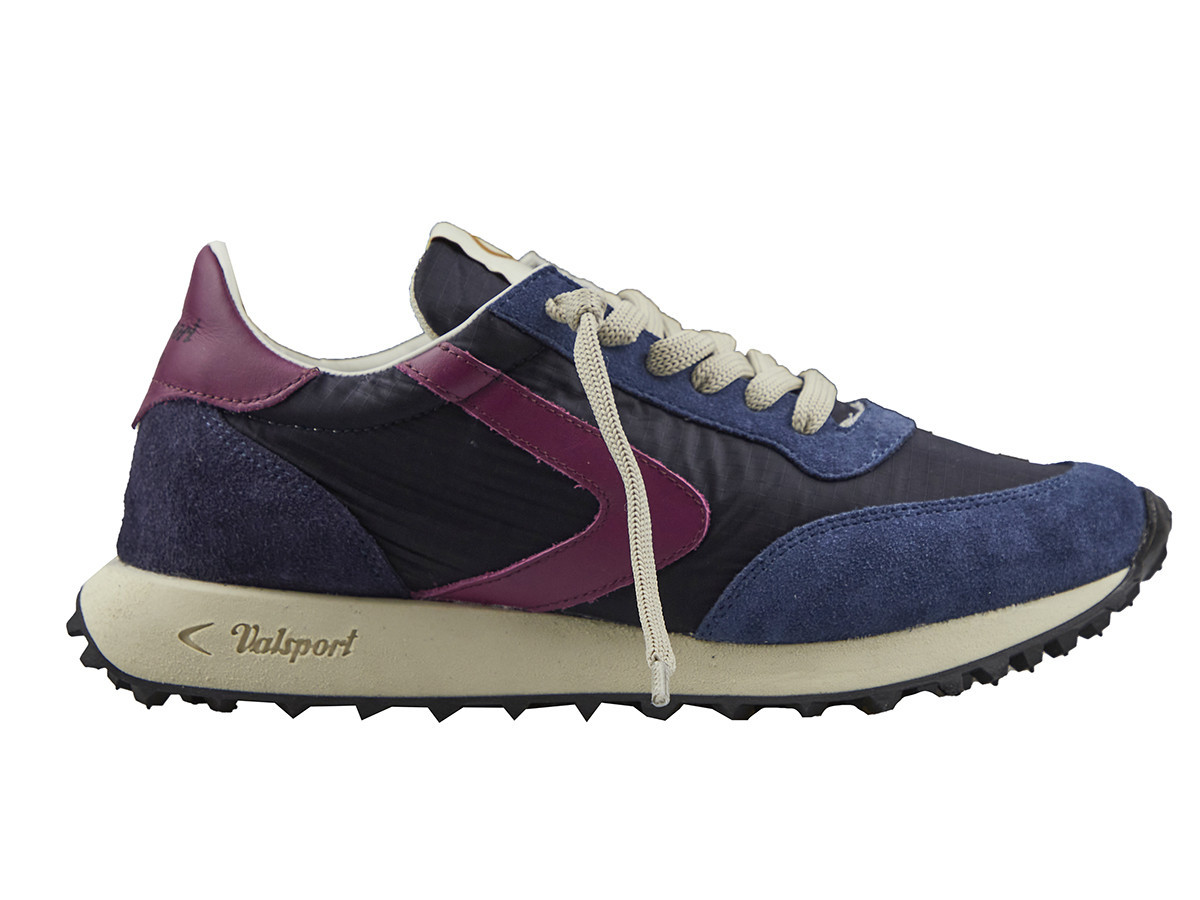 Sneakers donna Start Heritage Valsport. Realizzate in suede e tessuto blu con boomerang in nappa. Sottopiede in pelle estraibile, fondo gomma stile heritage 4,5 cm. Scarpe fatte a mano in Italia.