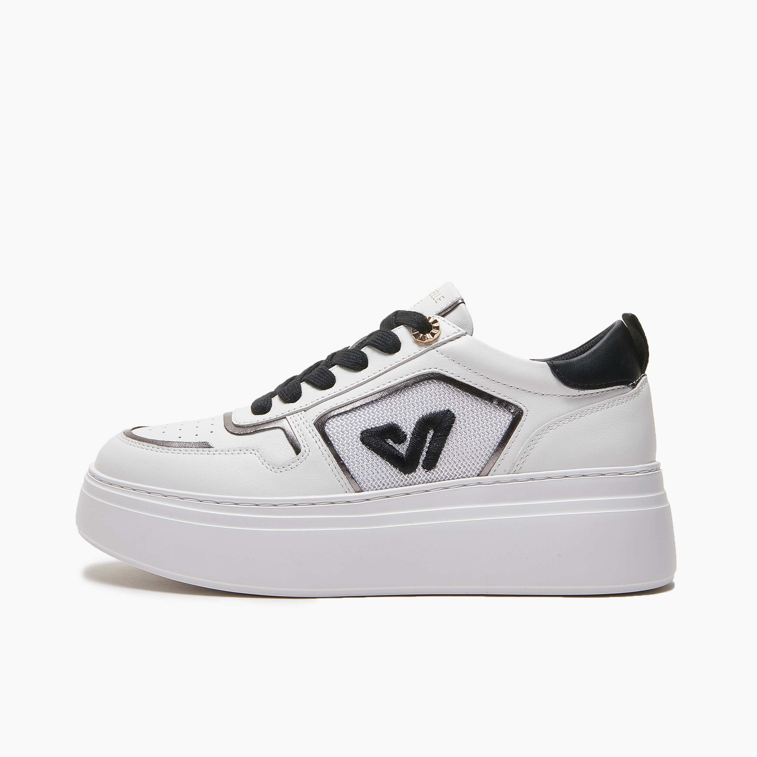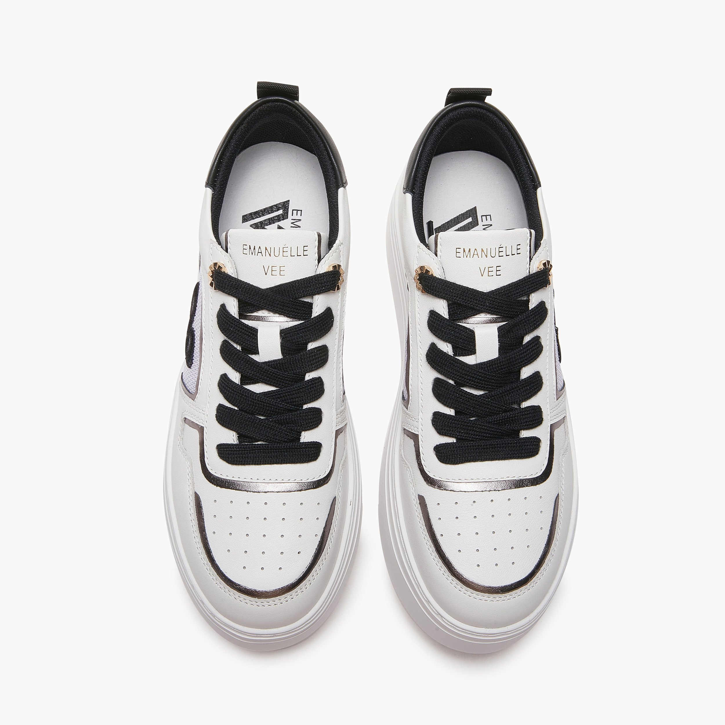 Sneakers donna Bice Emanuelle Vee in pelle e tessuto white con inserti black. Sottopiede in pelle estraibile, suola alta in extra light 5 cm.