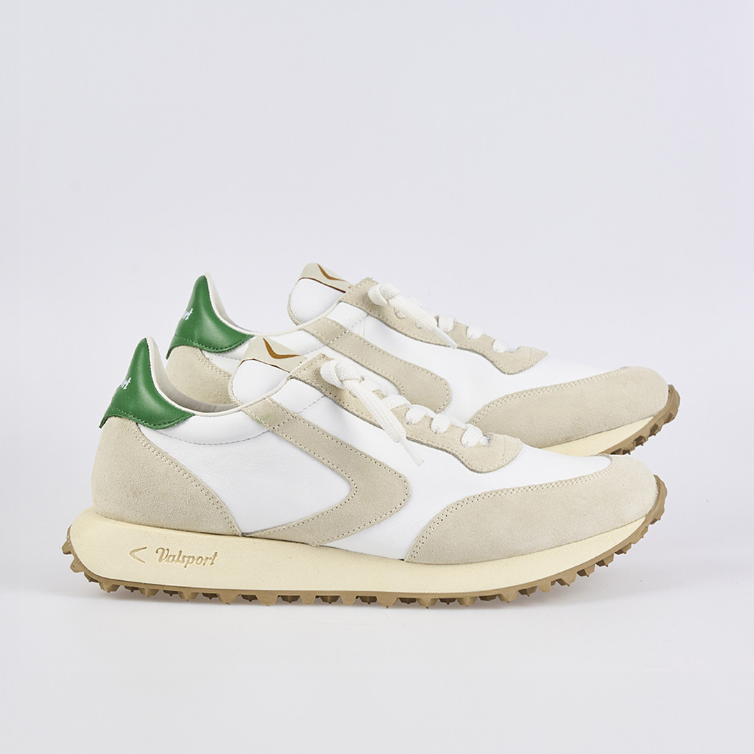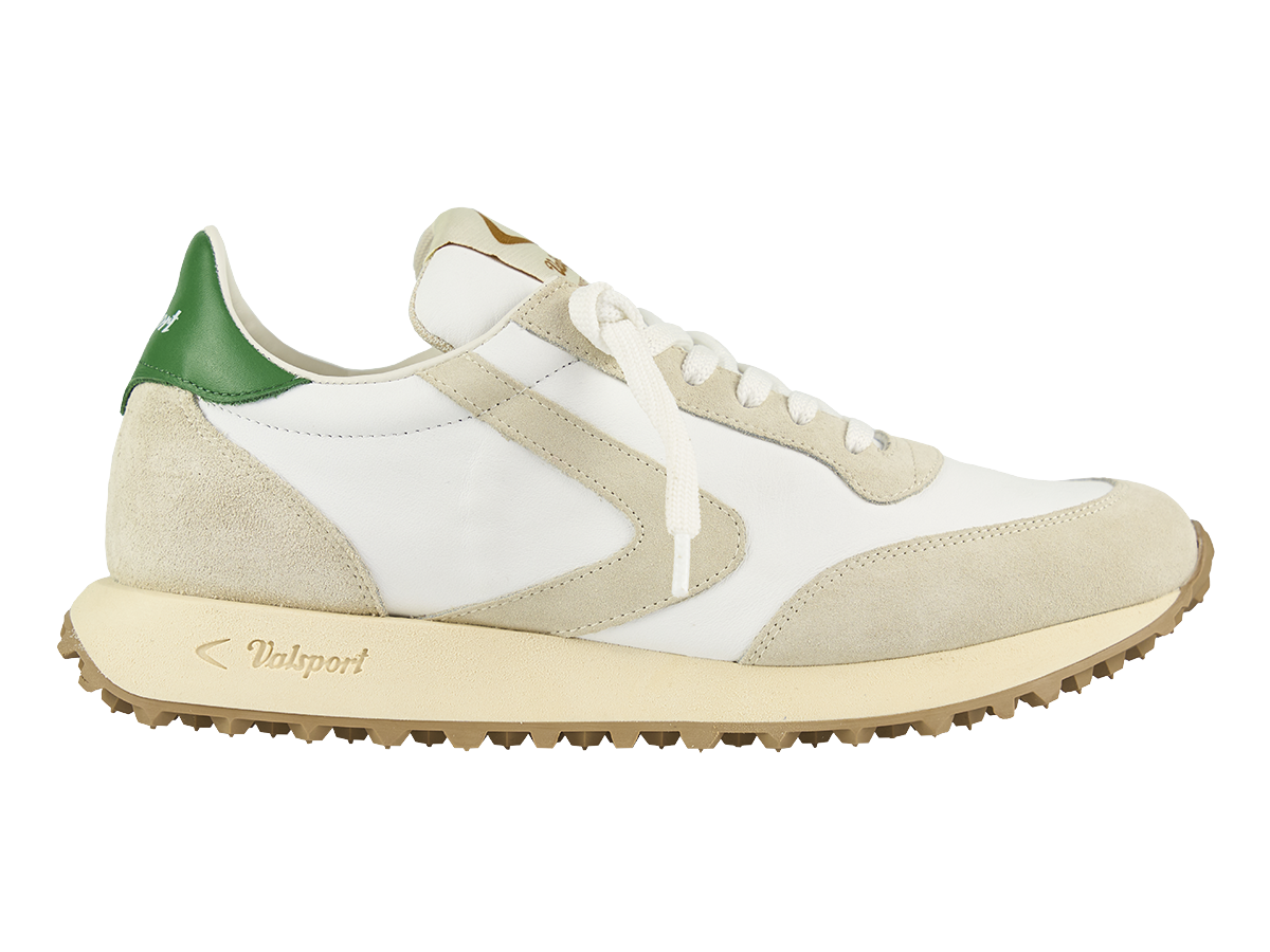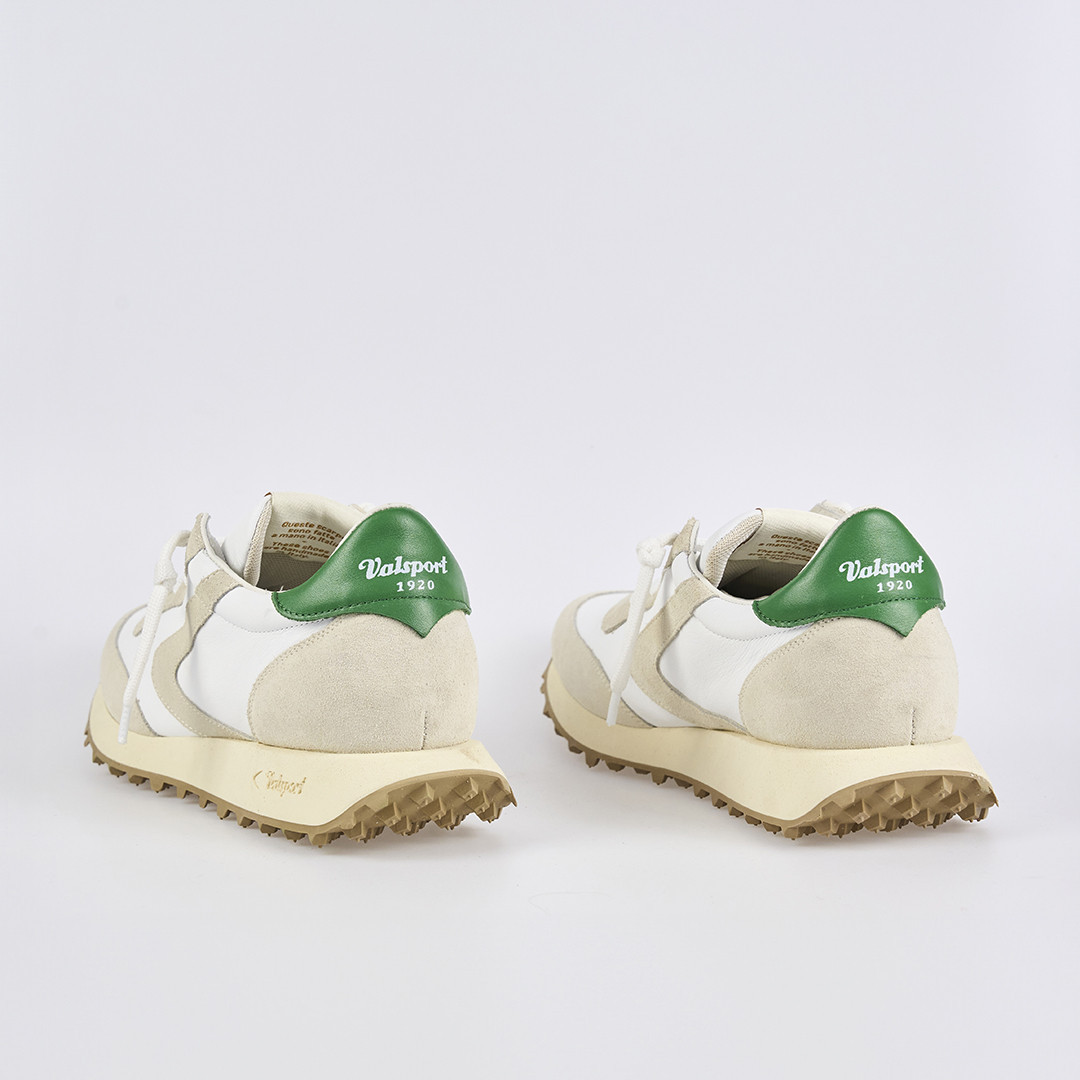 Sneakers uomo in nappa e suede Valsport. In morbida nappa bianca con inserti in camoscio beige e loop logato verde sul tallone. Suola in gomma disegnata da Valsport. Lavorazione artigianale Made in Italy.