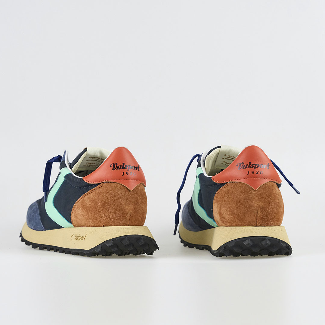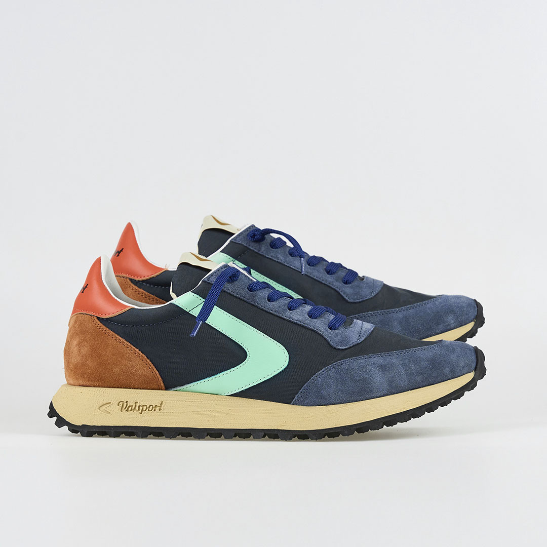 Sneakers uomo Start Nylon Vintage blu Valsport. Realizzate in suede e tessuto con boomerang in nappa. Sottopiede in pelle estraibile, fondo gomma stile heritage 4,5 cm. Scarpe fatte a mano in Italia.