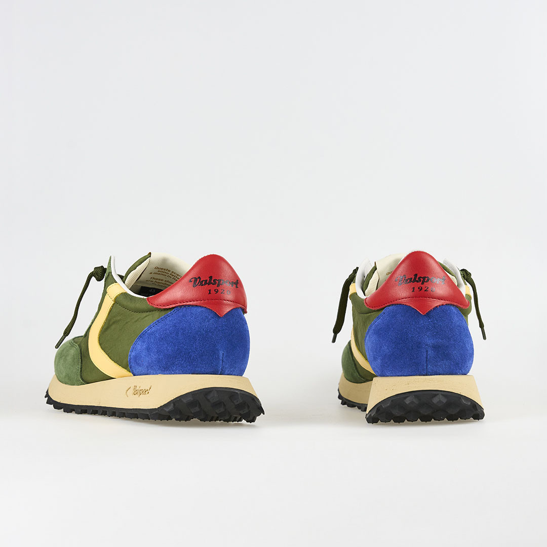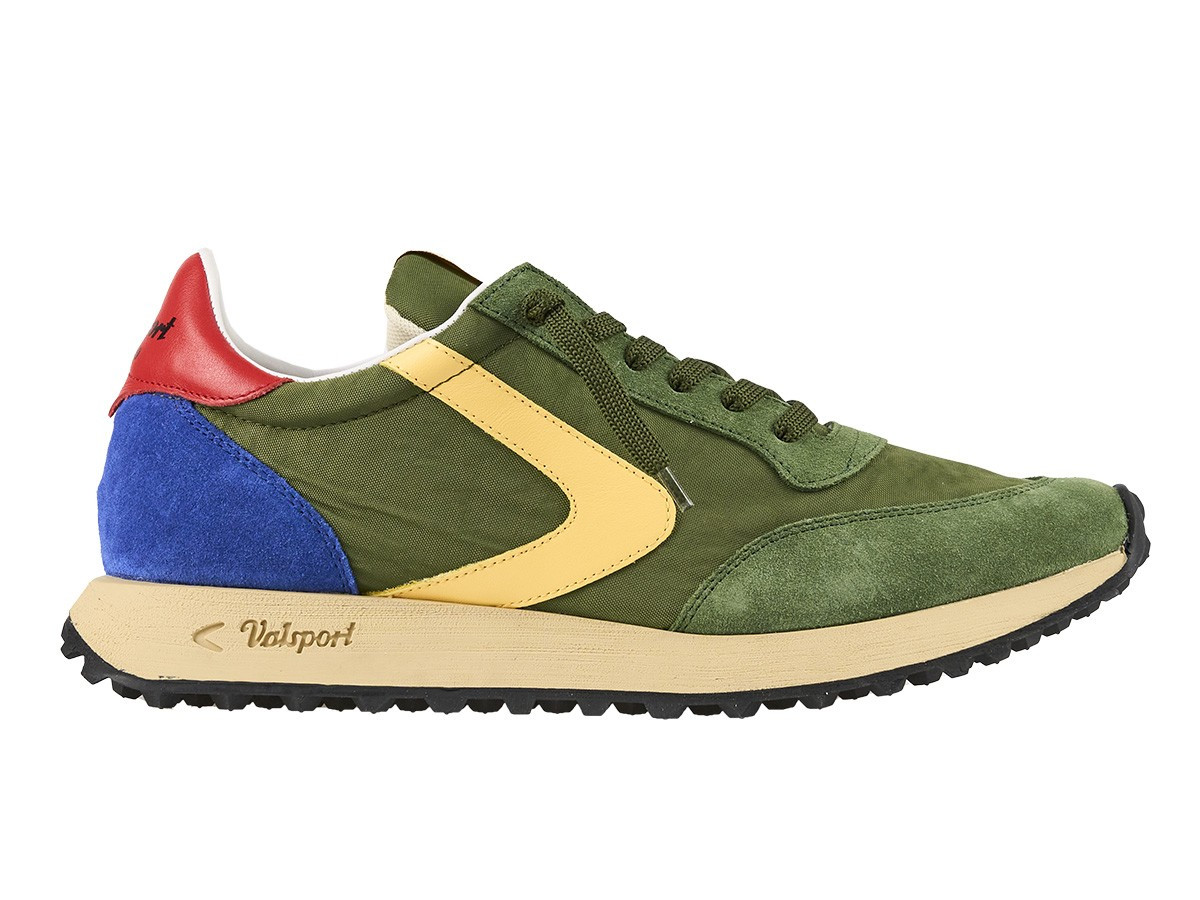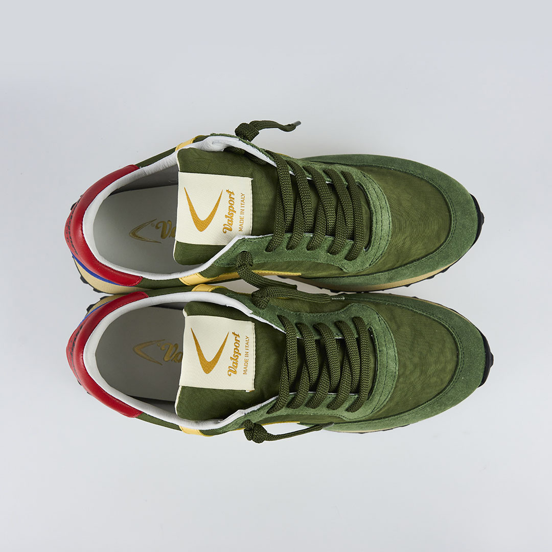 Sneakers uomo Start Nylon Vintage verde Valsport. Realizzate in suede e tessuto con boomerang in nappa. Sottopiede in pelle estraibile, fondo gomma stile heritage 4,5 cm. Scarpe fatte a mano in Italia.
