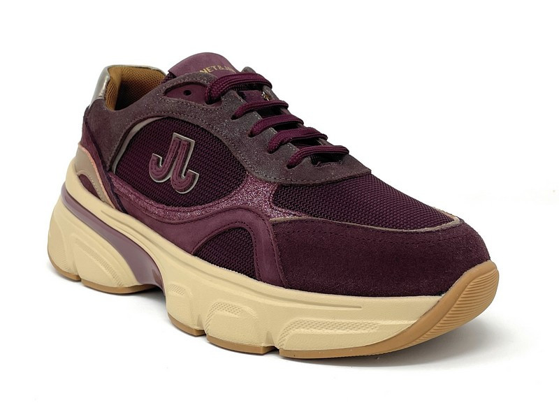 Sneakers donna in camoscio, tela e pelle Janet & Janet con inserti laminato. Chiusura con lacci, morbido plantare in pelle estraibile su fondo gomma 5 cm.