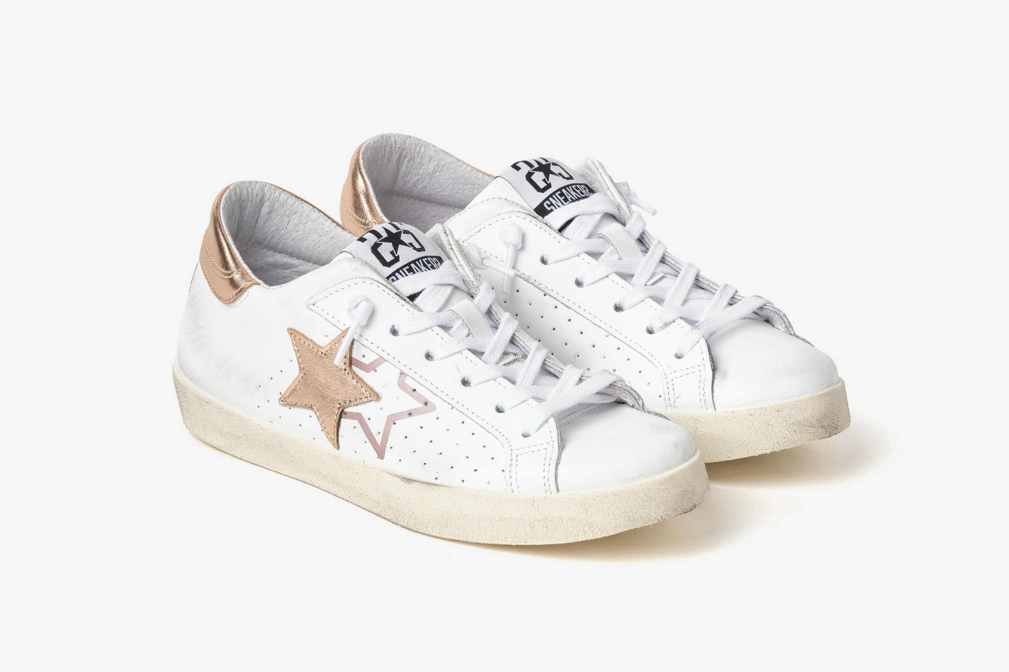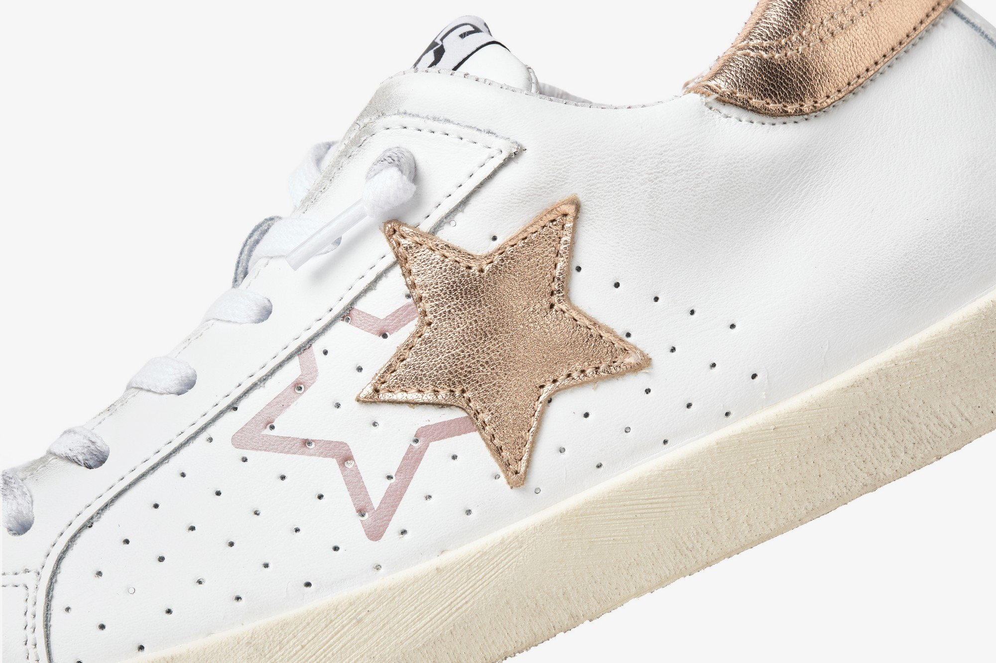 Sneakers donna Prime star white-rame 2Star. Tomaia in pelle bianca con dettagli in contrasto laminato argento. Fodera in pelle con sottopiede imbottito estraibile rivestito in pelle. Fondo gomma platform 3,5 cm. Made in Italy.