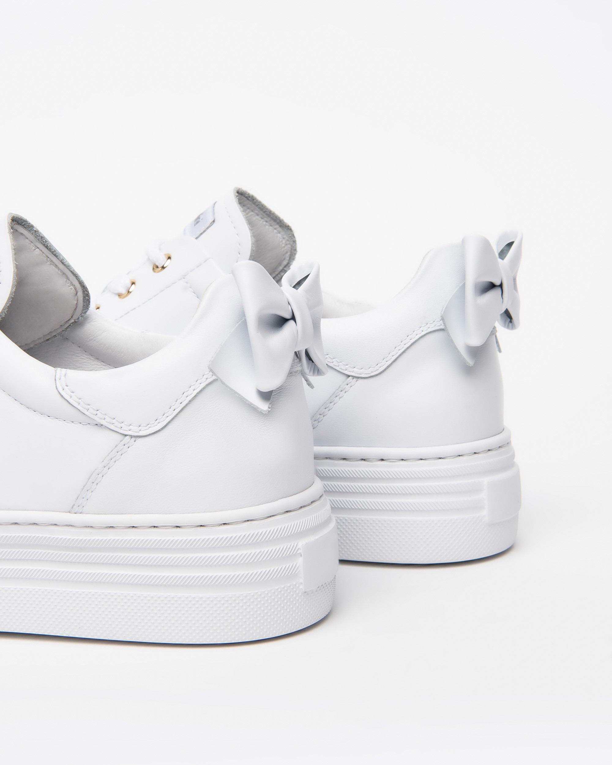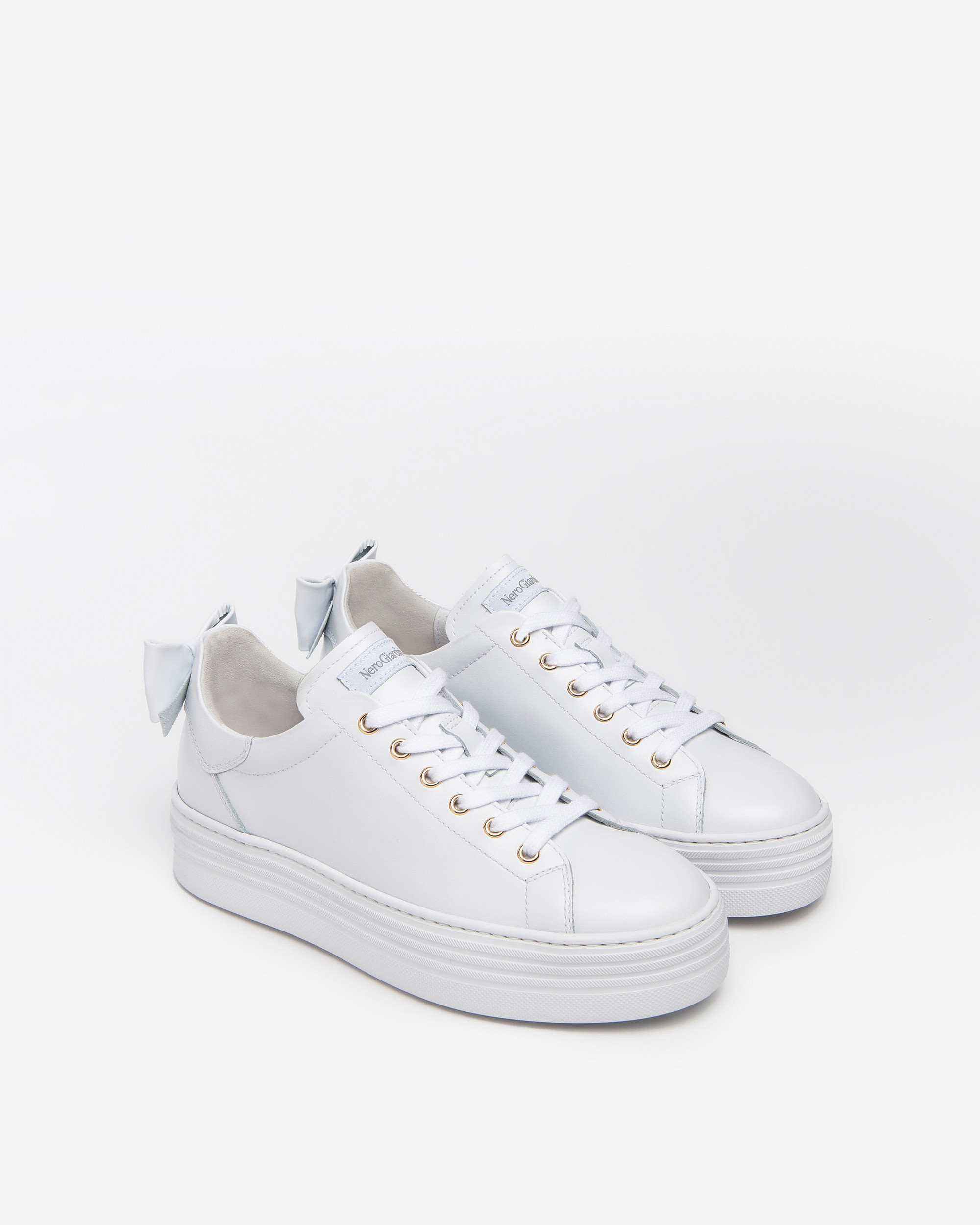 Sneakers donna in pelle bianca con fiocco sul tallone Nero Giardini. Sottopiede estraibile con tecnologia DryGo! assorbe l'umidità e garantisce confort e benessere. Fondo cassetta 4cm.