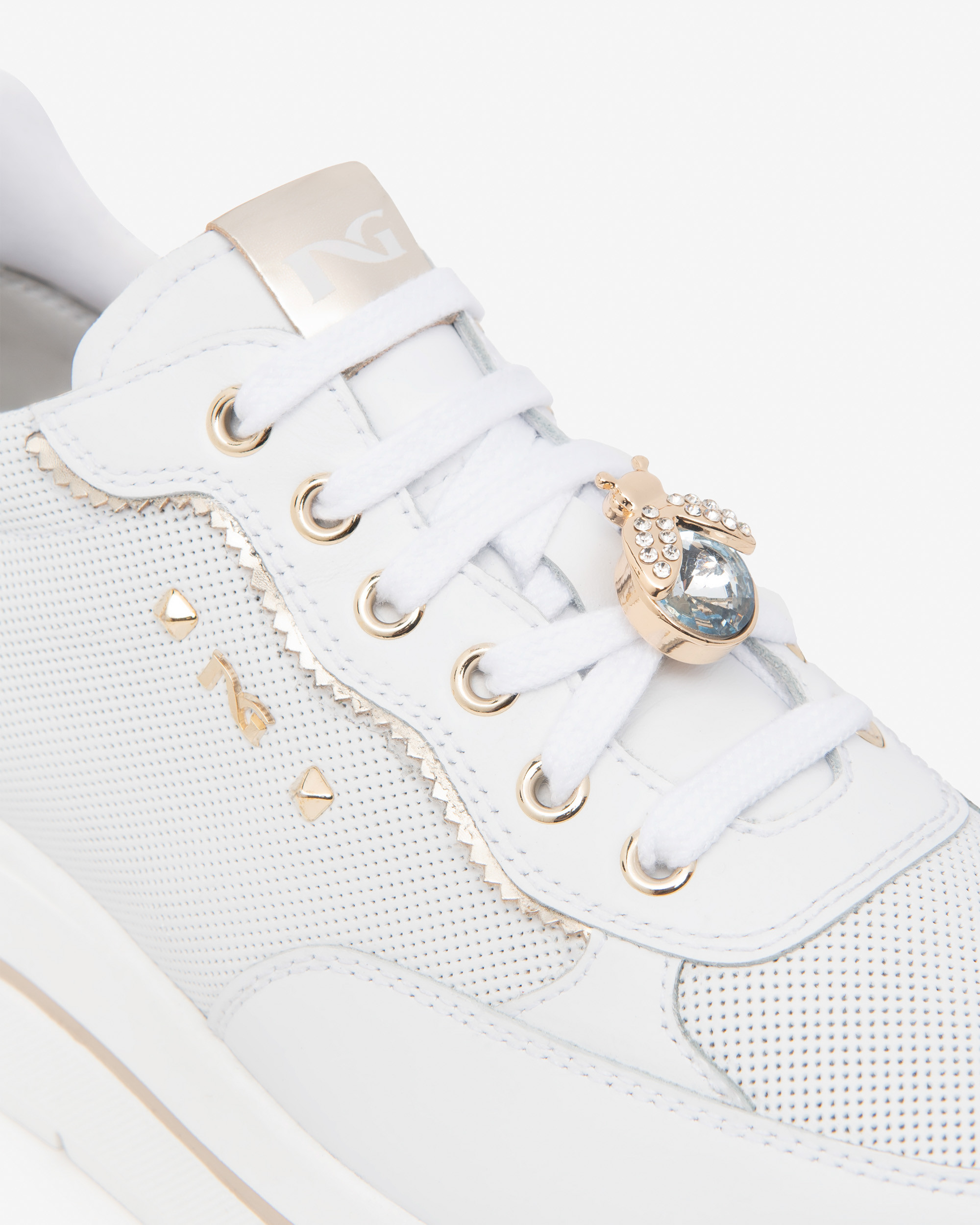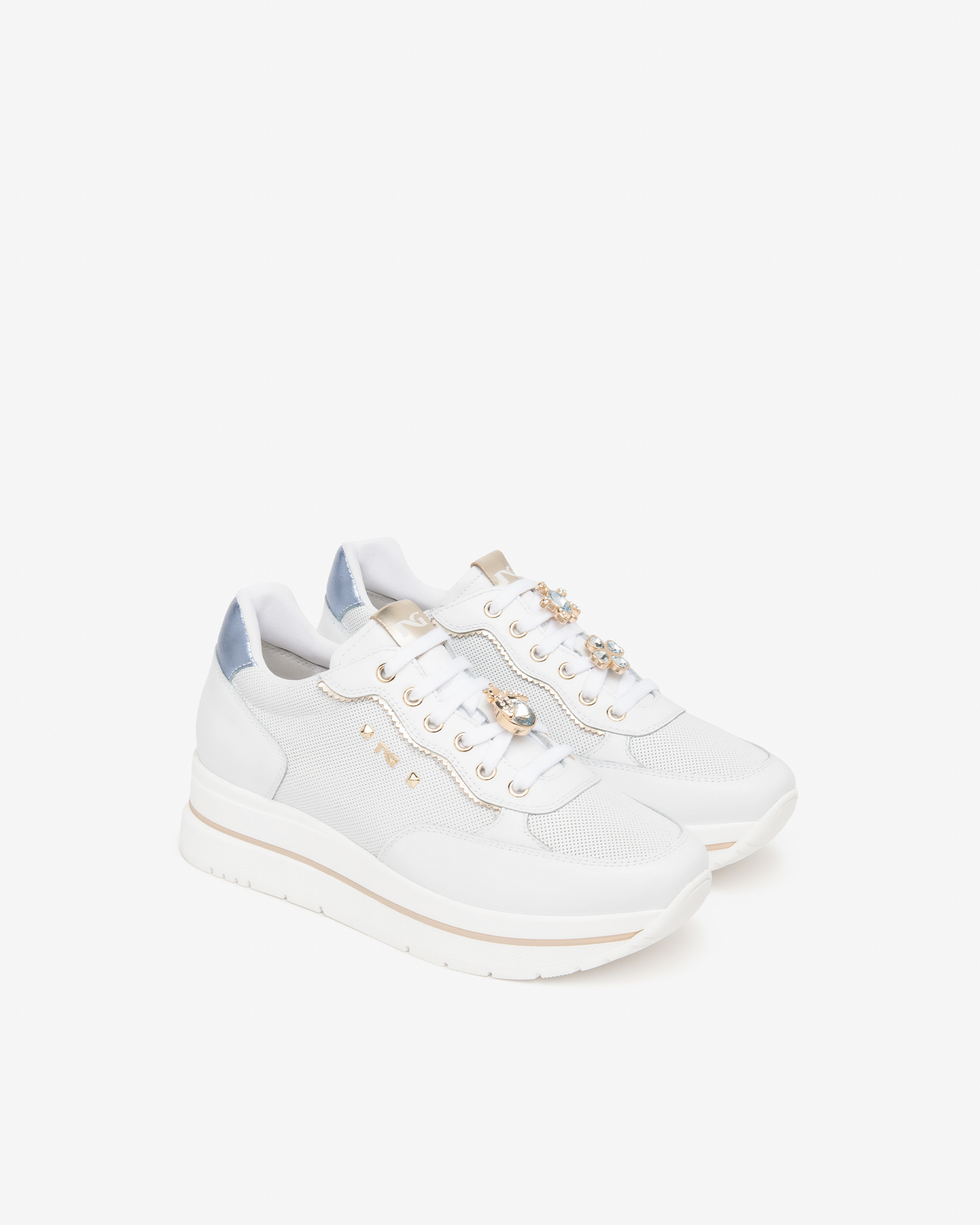 Sneakers donna in pelle Nero Giardini con accessorio gioiello. Chiusura con lacci agevolata da zip. Sottopiede estraibile in pelle in memory, assicura comfort e benessere. Fondo gomma 4,5 cm. Vestibilità comoda. Made in Italy.