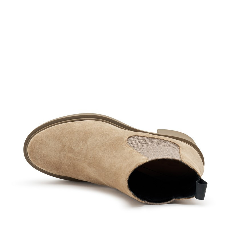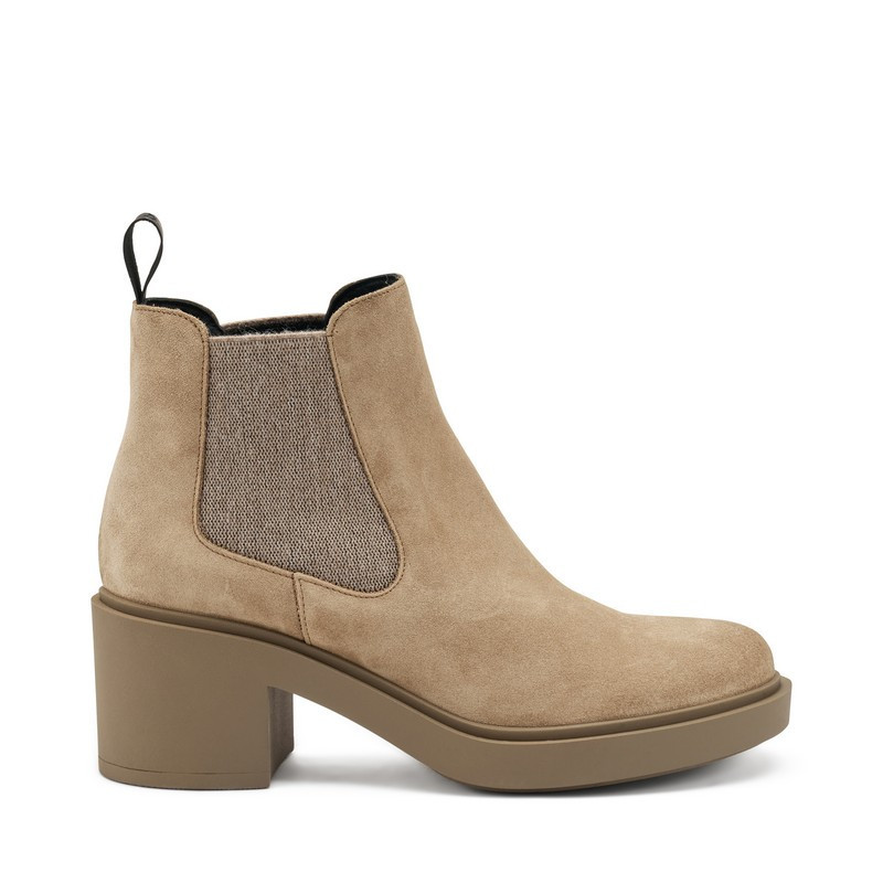 Beatles donna con tacco in camoscio Frau. Con elastici laterali e loop sul tallone per facilitare la calzata. Altezza gambale 10,5 cm, tacco 6 cm.