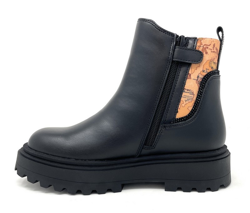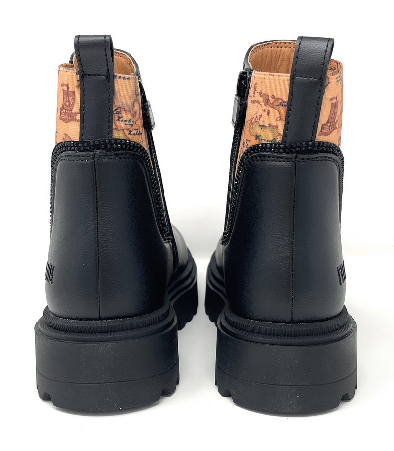 Tronchetti con elastico geo ed inserto strass Alviero Martini. Chiusura con zip sul lato interno, plantare in pelle estraibile e fondo gomma 4,5 cm.