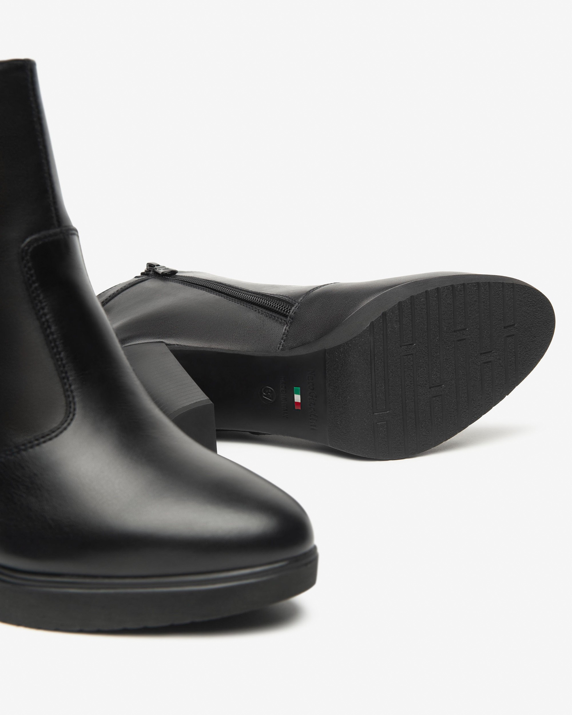 Tronchetti donna in pelle Nero Giardini. Chiusura con zip laterale, interno in pelle con morbido sottopiede in memory. Fondo gomma con tacco a cono 9,5 cm. Made in Italy.