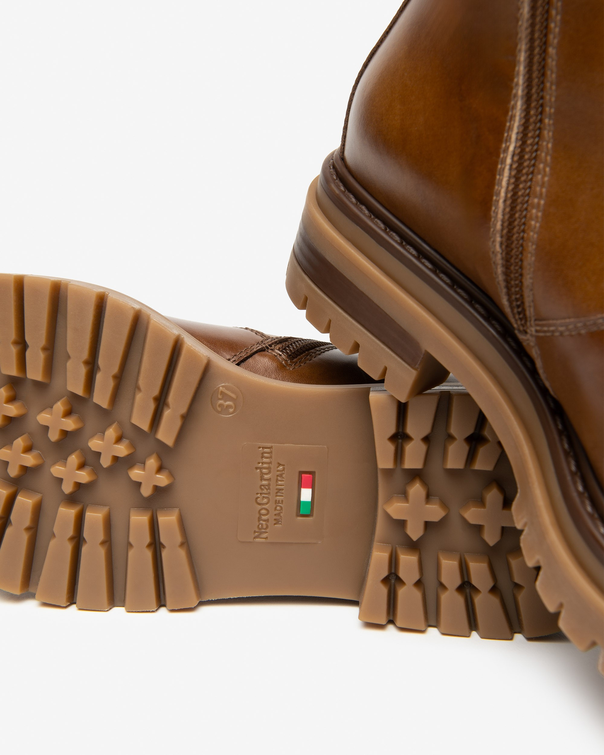 Stivaletti donna in pelle Nero Giardini con fibbia logata sul gambale. Chiusura con zip, interno in pelle e fondo gomma roccia con tacco a blocco 5 cm. Made in Italy.