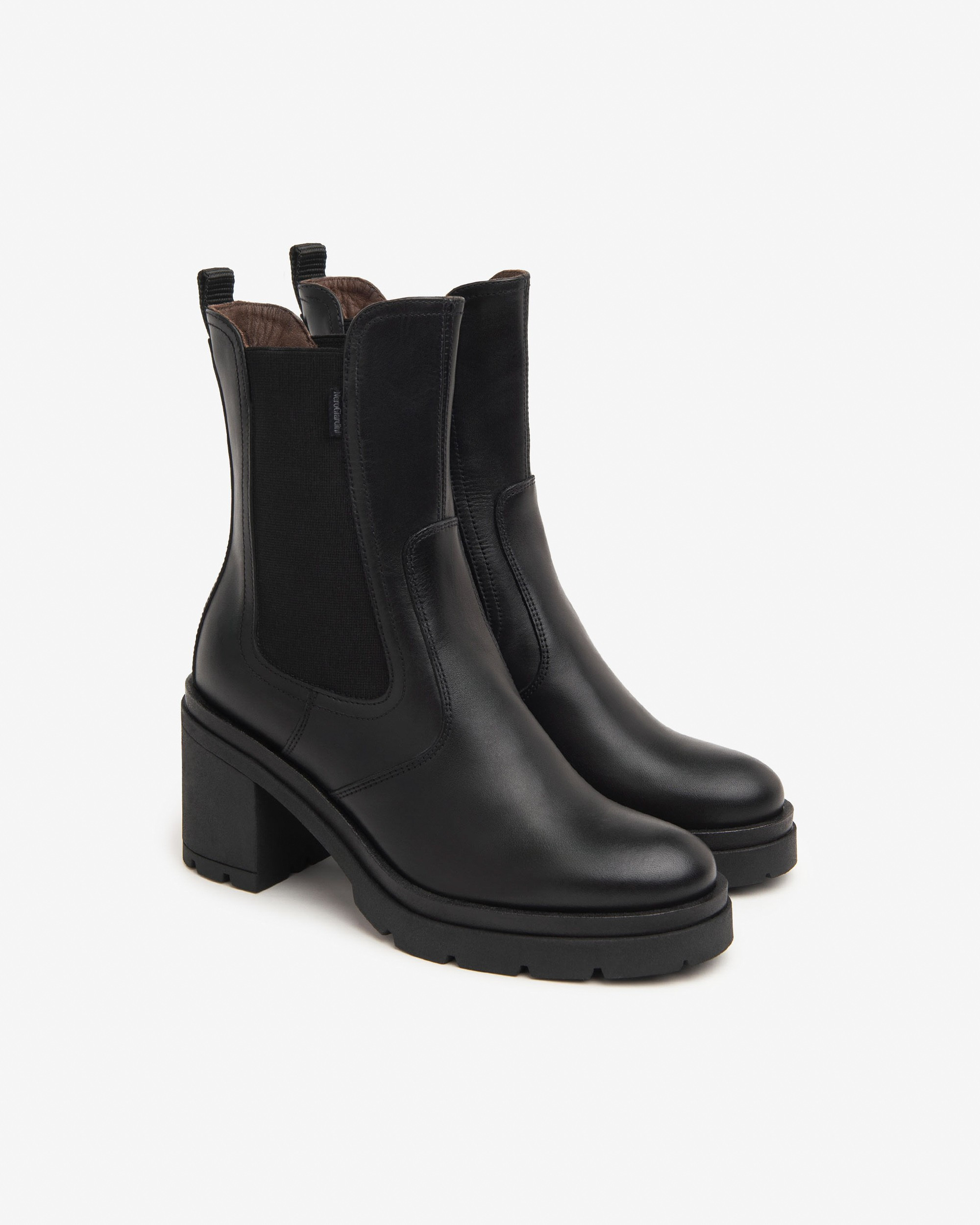 Stivaletti donna in pelle Nero Giardini con elastici bilaterali e loop per facilitare la calzata. Interno in pelle e fondo gomma con tacco a blocco 8 cm. Made in Italy.