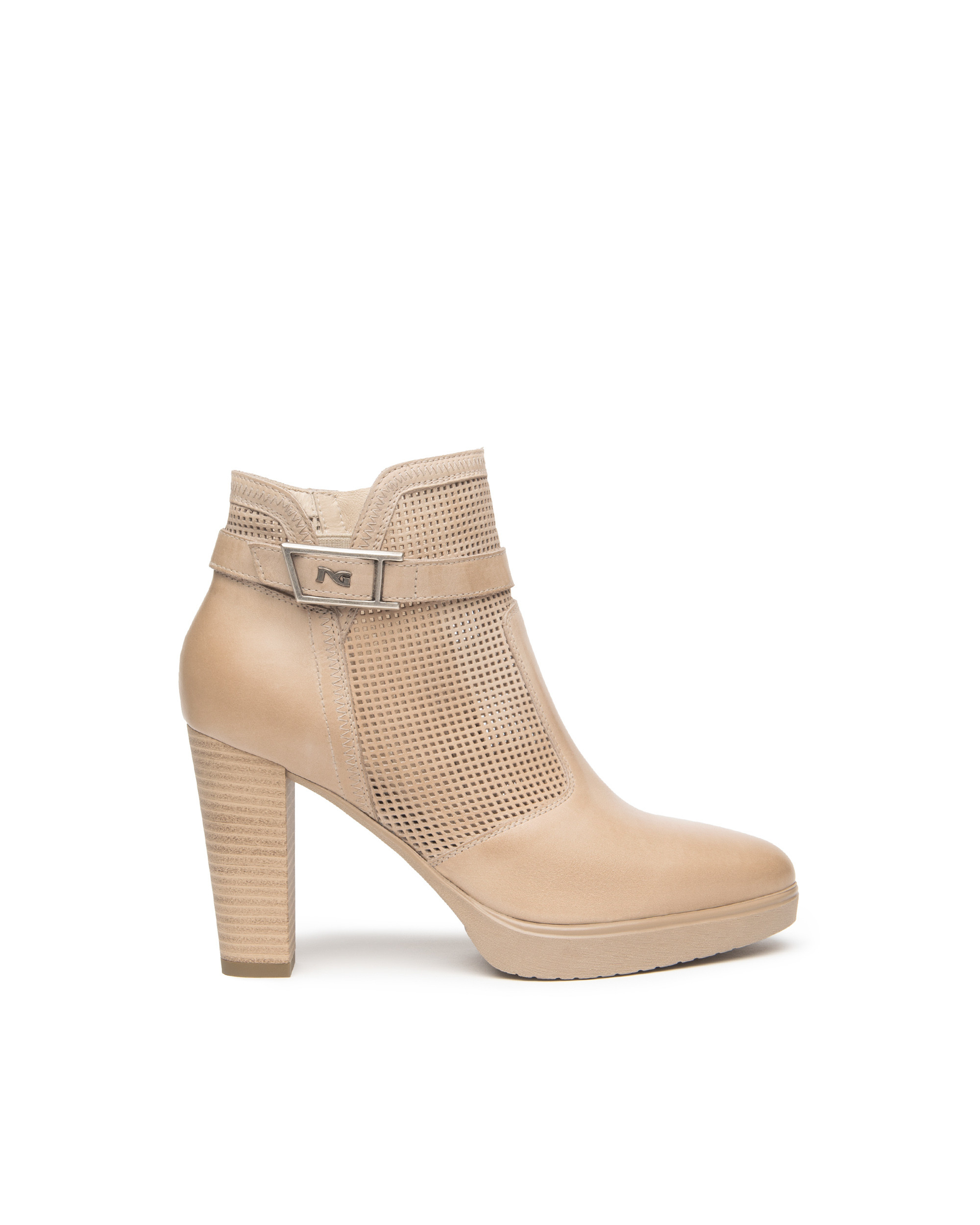 Stivaletti donna in pelle Nero Giardini con inserto traforato. Chiusura con zip sul lato interno, fodera e sottopiede in pelle, plateau 1,5 cm e tacco a cono 9,5 cm. Made in Italy.