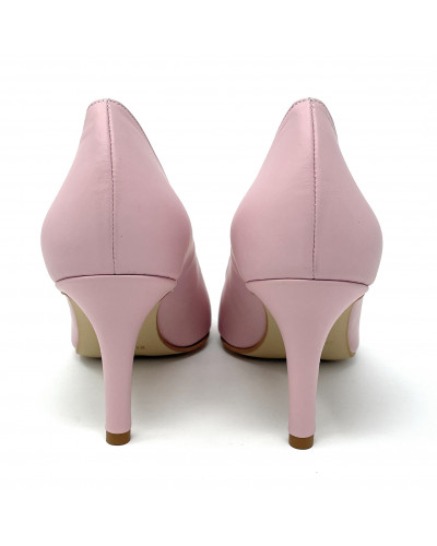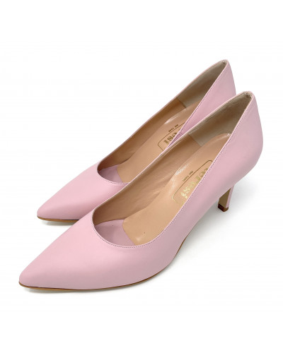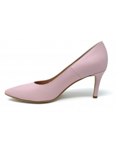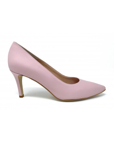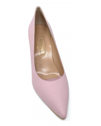 Teresi décolté in vitello cipria con sottopiede leggermente imbottito e fondo gomma per una calzata facile e confortevole. Punta affusolata e tacco a stiletto 7 cm.