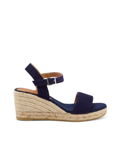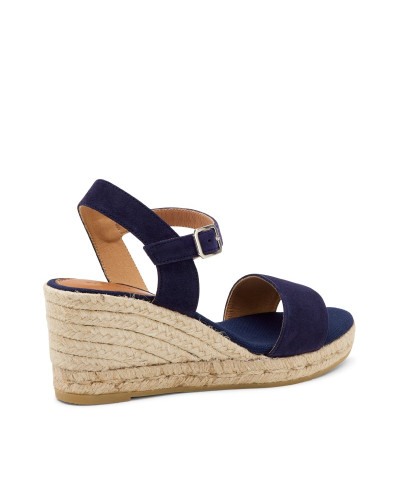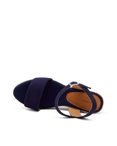 FRAU sandalo con zeppa rivestita in rafia. Tomaia in camoscio monofascia blu, con cinturino regolabile alla caviglia. Sottopiede imbottito e fondo gomma. 7cm.