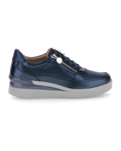 Sneakers donna laminata blu Stonefly con zip per una calzata pratica e veloce. Interno e sottopiede estraibile in pelle. Fondo zeppa 4,5 cm.