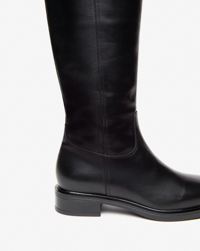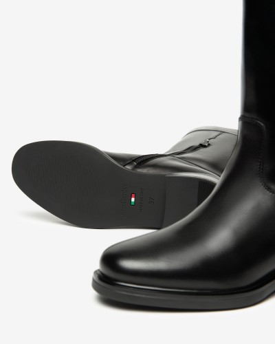 Stivali donna in pelle Nero Giardini con logo laterale. Chiusura con zip. Interno in pelle, sottopiede estraibile con tecnologia DryGo! assorbe l'umidità e garantisce benessere. Fondo gomma con tacco a blocco 3 cm. Made in Italy.
